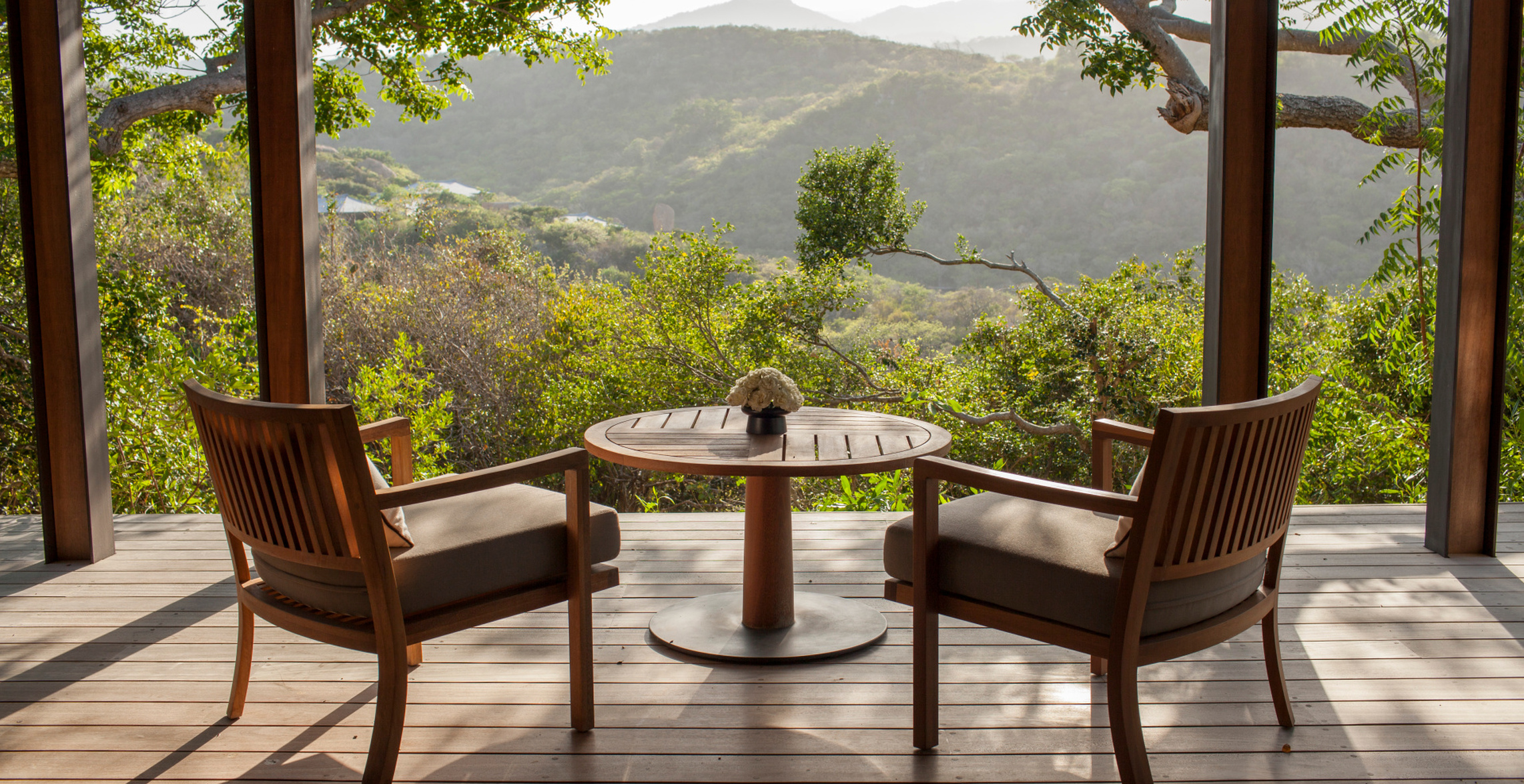 Hiên tắm nắng riêng bằng gỗ và hướng nhìn ra biển tuyệt đẹp. Ocean Pavilion hướng biển có các khu vực phòng khách và phòng ngủ liền kề, mở ra ban công với sàn gỗ và khu vực ngắm cảnh với tầm nhìn hướng ra Biển Đông.