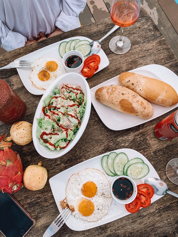 Bữa sáng thứ 2 mình có gọi ăn sáng tại Lee’s house, có gọi 2 phần bánh mì ốp la hết 40k/ phần + 1 phần salat cá ngừ 60k, 1 lon strongbow 27k.