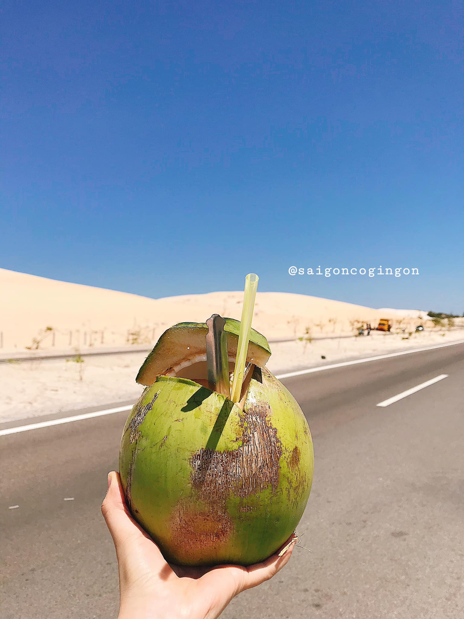 Ngày thứ 2: Mình tra bác gồ đi Bàu Trắng, mất hơn tiếng chạy xe ra Bàu Trắng để chụp hình, không quên ghé làng chài ăn đĩa bánh bèo ngon ơi ngon 10k á mọi người, đồ ăn Phan Thiết siu rẻ và ngon vô cùng. Dọc đường đi có nhiều cung đường biển rất đẹp, đáng để thắng lại chụp hình lắm nhe! Ra tới Bàu Trắng mình ghé xe dừa màu vàng, để checkin và chụp hình. Giá nước giao động: 10k – 25k thôi. Hết cả buổi sáng để quay lại Mũi Né, mình thay đồ đi cà phê tại Chamelon Beach Bar tầm tầm xế chiều, nắng rất đẹp. Giá nước dao động 50K – 70K. Mình nhớ gỏi Thái là 80K thì phải (tầm giá đó thui mọi người)