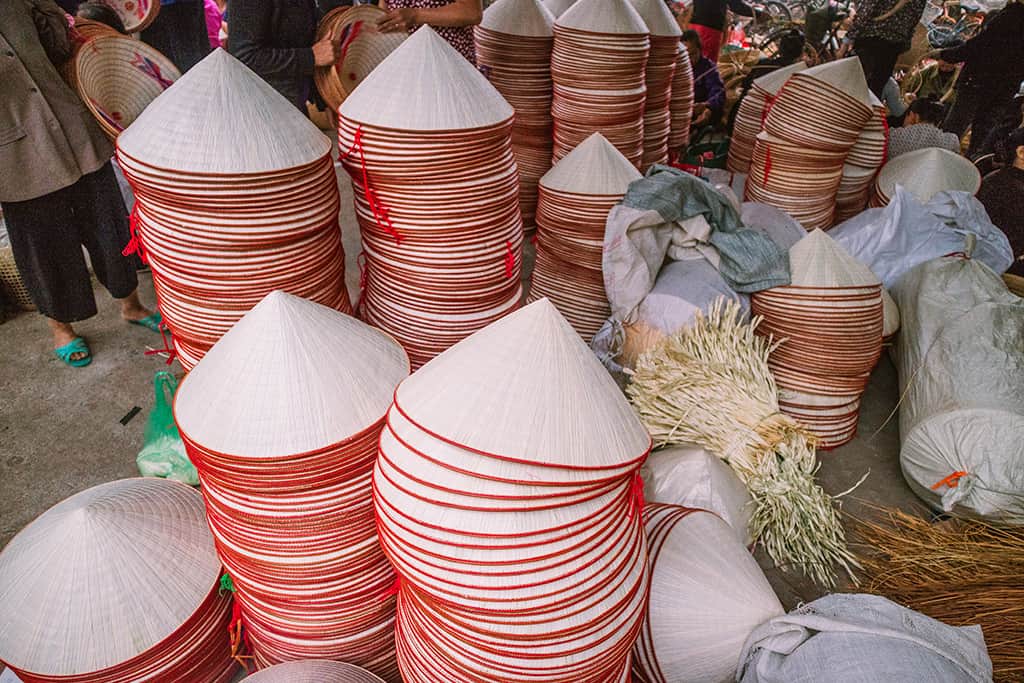 Vào các ngày 4, 10, 14, 20, 24, 30 hàng tháng, phiên chợ nón lại tấp nập; các mẹ, các chị lại nhộn nhịp ra chợ để chào bán sản phẩm độc đáo của quê hương. Đón du khách ngay từ đầu chợ là sắc đỏ rực bắt mắt của các sạp bán nguyên liệu như dây cước, dây len các loại…