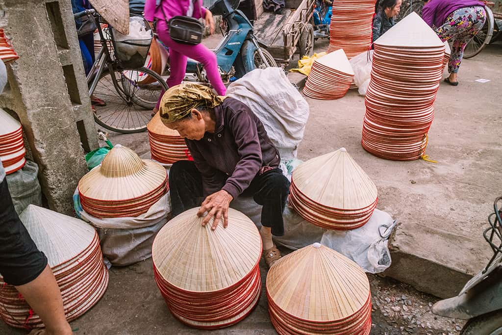 Cảnh mua bán tuy tấp nập nhưng không hề cảm thấy quá ồn ào và náo nhiệt, chuyện mặc cả, ra giá cũng rất nhẹ nhàng, thuận mua vừa bán chứ chẳng kì kèo quá mức. Người thì mua nón, người mua lá, người mua khung, mua nan tre, cảm giác ai ai cũng hài lòng với thành quả của mình khi dắt xe ngược lên dốc chợ để đi về.
