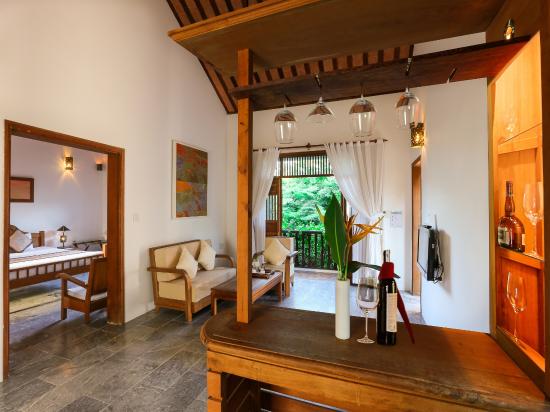 Các phòng tại khách sạn đều có sân hiên nhìn ra hồ nước và máy điều hòa nhiệt độ, một số phòng có ban công và được trang bị nội thất cơ bản tươm tất. Nối liền các bungalow với nhau là những cây cầu gỗ nhỏ thơ mộng bên trên làn nước xanh ngắt. Bạn tha hồ mà sống ảo nhé!