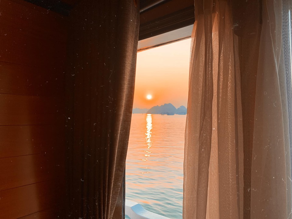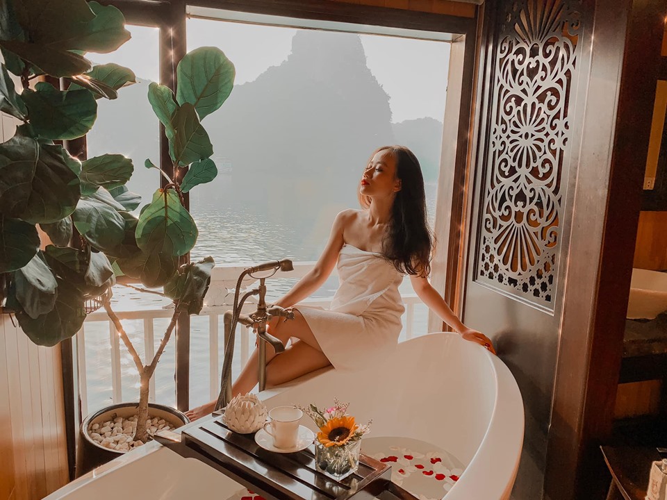 Thời điểm đẹp nhất trong ngày có lẽ là vào lúc sớm bình minh, khi ánh nắng bắt đầu lấp lánh trên mặt nước, là khi ngâm mình thư giãn trong chiếc bồn tắm phủ đầy cánh hoa hồng, mắt hướng ra ngắm nhìn vịnh biển, vô tư lự như chả còn vướng bận điều gì trên thế gian. Còn buổi tối, một bữa ăn được set up trên sân hiên phía mũi tàu, dưới ánh nến lung linh và gió vịnh lướt qua mát lành, chắc chắn sẽ làm hài lòng cả những ai khó tính.