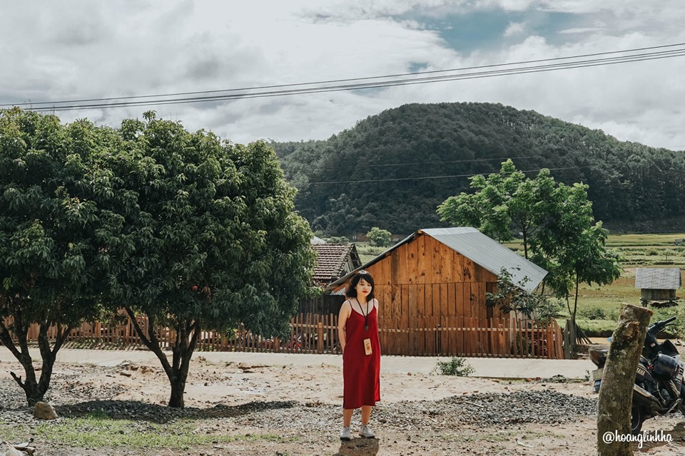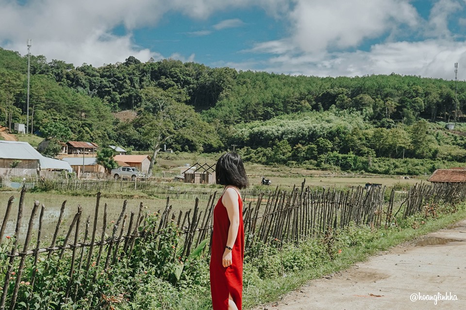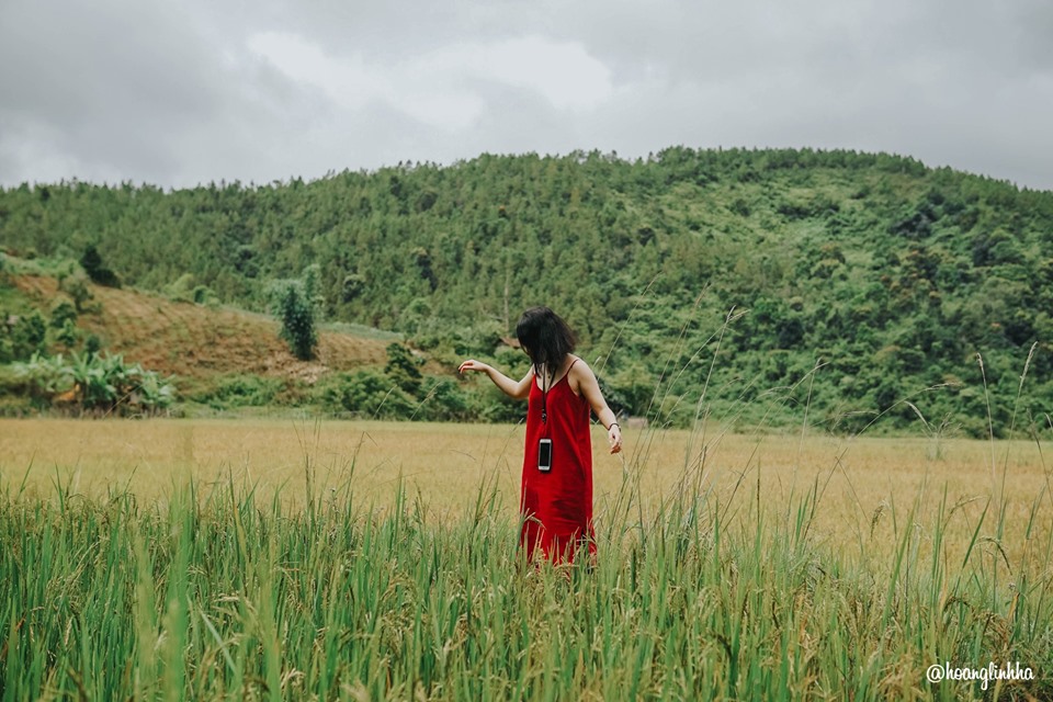 Một buổi chiều dạo quanh làng Konbring chính là điều khiến tớ quyết định “băng rừng lội suối” qua quãng đường 400 km từ Huế đến Măng Đen. Chỉ cần rẽ phải đổ xuống dốc, cảm giác yên bình đã đong đầy. Con đường làng nhỏ đưa tớ đi qua những căn nhà sàn, những ruộng lúa trổ bông vàng, lên đến một ngọn đồi thật cao. Đây là một trong bốn làng văn hóa du lịch cộng đồng của huyện Kon Plông, với hơn 90% là người dân tộc Mơ Nâm, mưu sinh chủ yếu từ việc trồng lúa.
