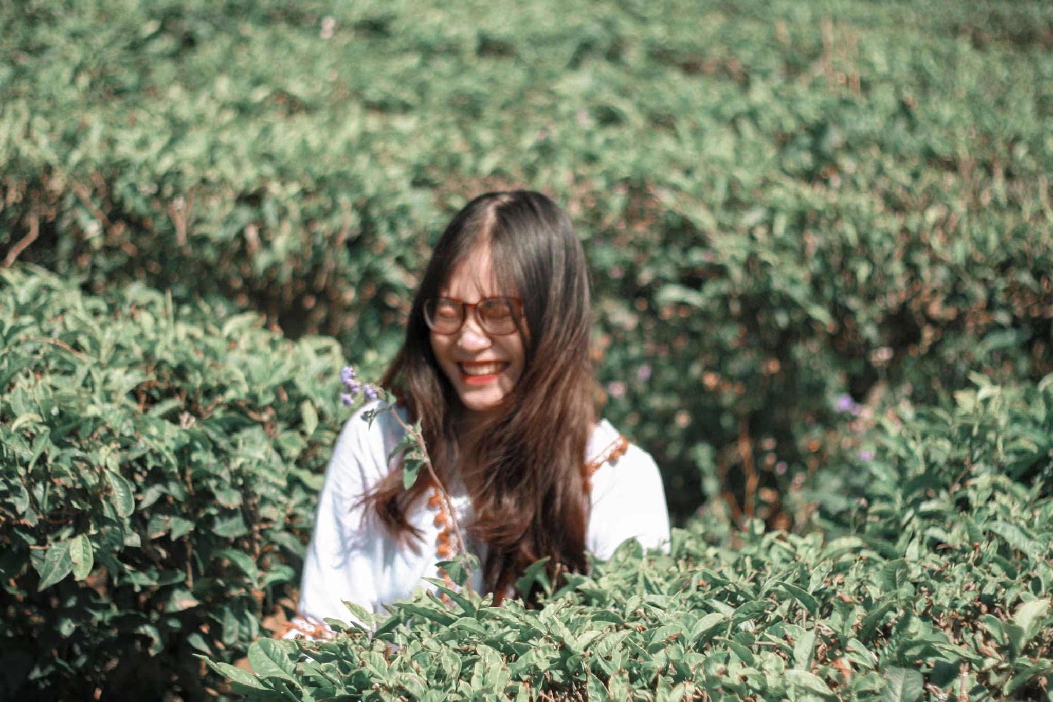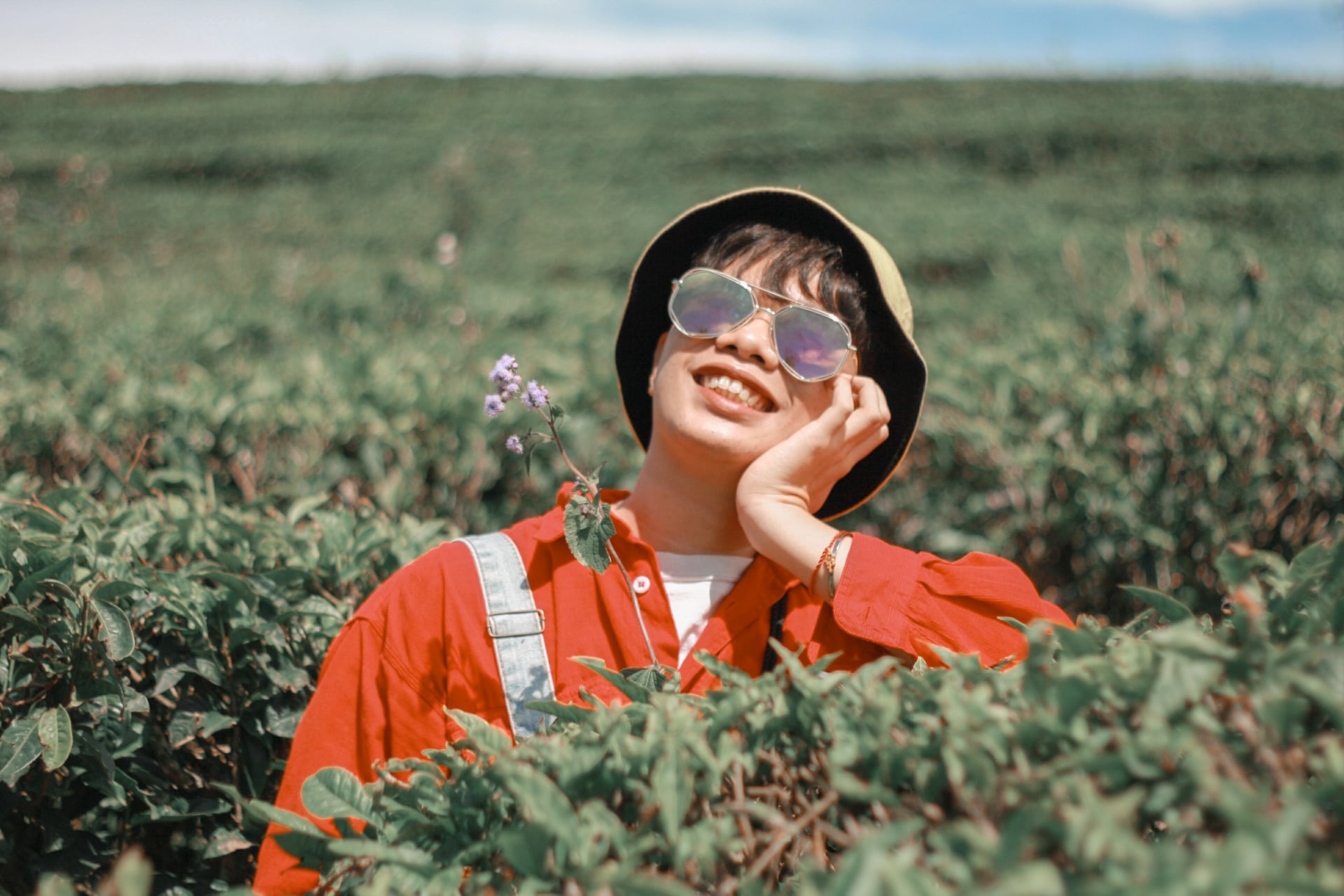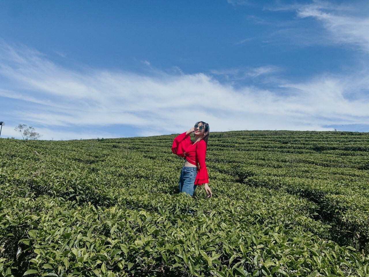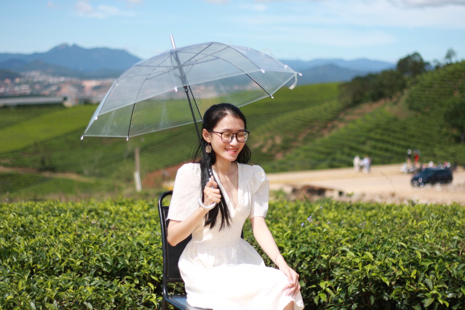 Lịch trình ngày 2 của tụi mình đi khá xa – đồi chè Cầu Đất, cách gần 30km nhưng 1 cung đường đó đi qua cánh đồng hoa cẩm tú cầu và quán café Túi Mơ To nữa nên cũng tiện. Sáng còn tỉnh táo thì đi một mạch tới đồi chè, chừng về mới ghé 2 điểm kia, đi sáng thứ 2 siêu vắng luôn, vắng đến nổi bãi giữ xe không có người coi xe, tụi mình 4 đứa, 2 cây xe trơ trọi giữa cái bãi đó, tự khóa cổ chứ không ai coi, lên thì tha hồ mà chụp ảnh. À mọi người đi ở đây nên mang theo dù tại lỡ mà mưa thì che mưa mà lỡ nắng thì che nắng chứ nắng lắm luôn ạ. À quên nữa quên nữa, Đà Lạt tuy lạnh nhưng mà có nắng, lại khô nữa, nếu không muốn lúc về đen thui và da khô cứng thì mọi người nhớ mang bao tay, bôi kem chống nắng, dưỡng ẩm blabla, nói chung là che kĩ dô nhan.