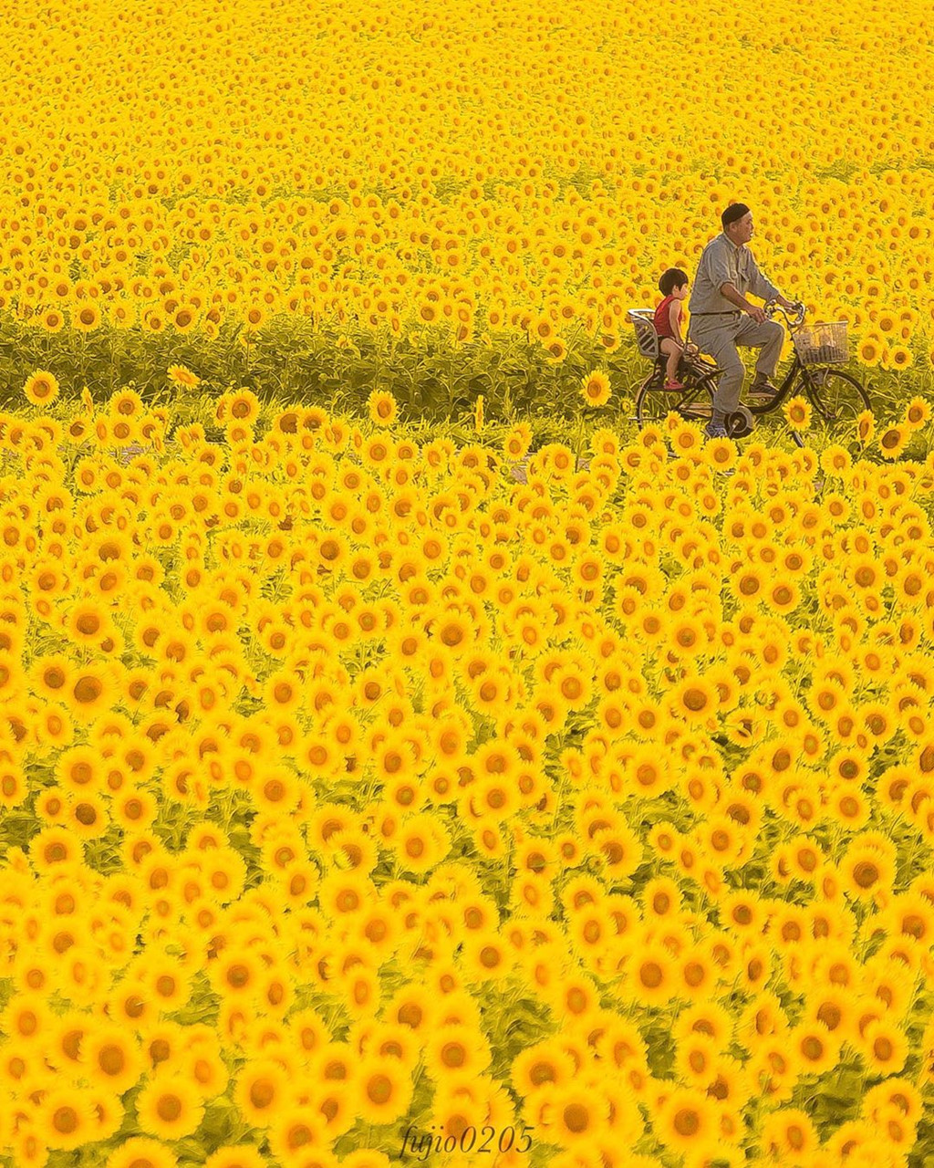 Cánh đồng Mashiko trải dài với hơn triệu cây hoa hướng dương được chăm sóc tỉ mỉ, hàng lối thẳng tắp. Một trong những kiểu ngắm hoa thú vị tại đây là chạy xe đạp dọc con đường nhựa xuyên cánh đồng. Ảnh: Fujio0205.