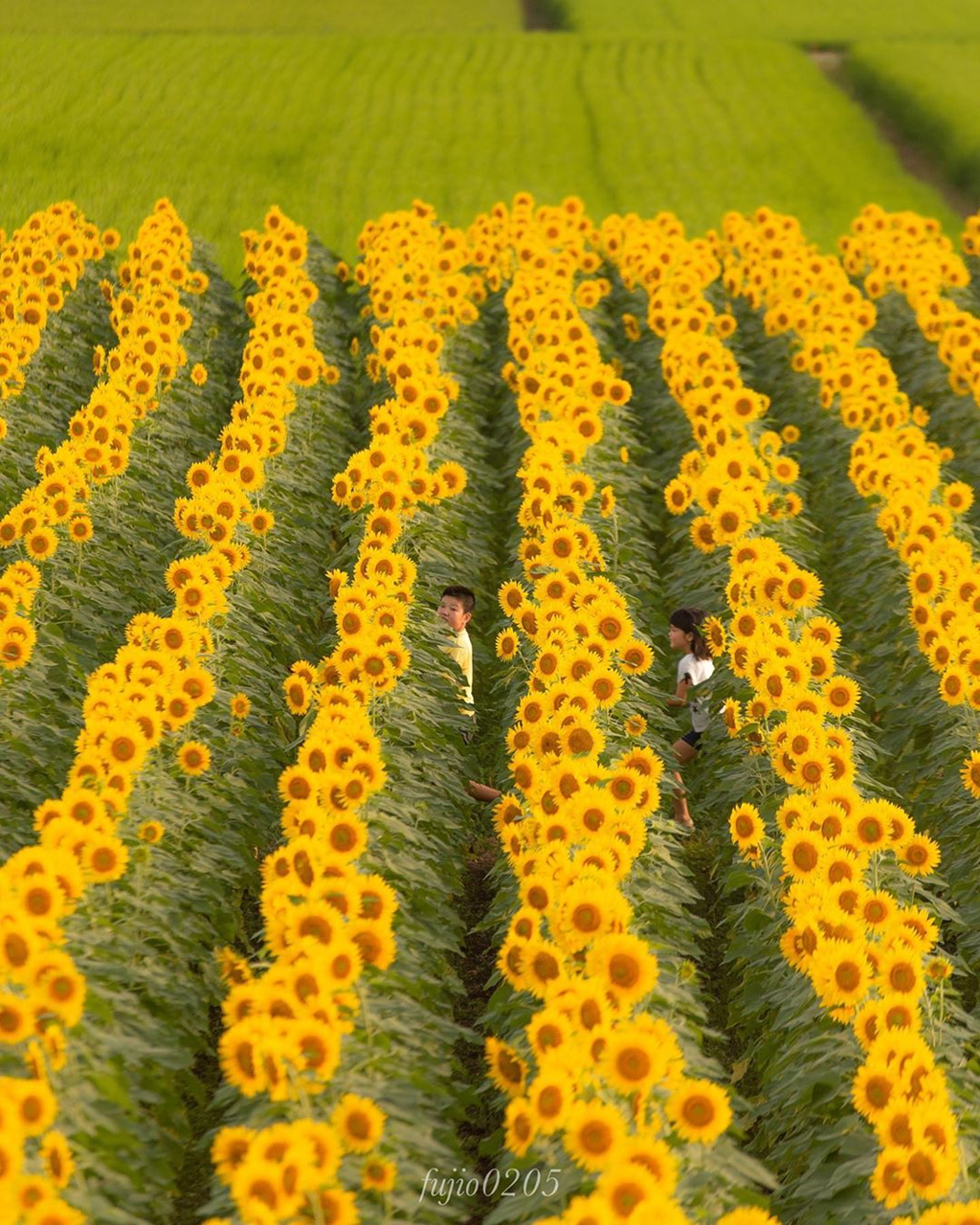 Tháng 8-10 hàng năm là thời điểm hoa hướng dương ở Mashiko khoe sắc rực rỡ nhất. Tuy không được nhiều người biết đến như cánh đồng hoa mặt trời Hokuryu ở Hokkaido, đồng hoa Mashiko được yêu thích bởi những cây hướng dương cao, đều tăm tắp. Ảnh: Fujio0205, keeesan1108.
