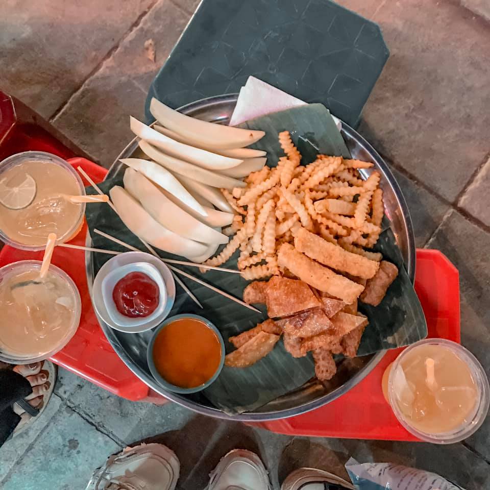 Trong ngõ Tạm Thương mình ở là bán nem chua rán hết. Nên tụi mình ăn ở đấy luôn rồi đến quán cafe nè!
