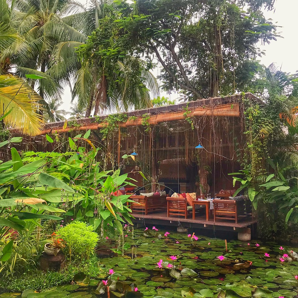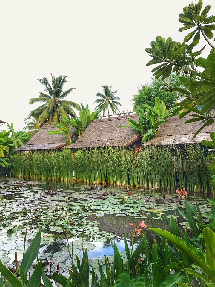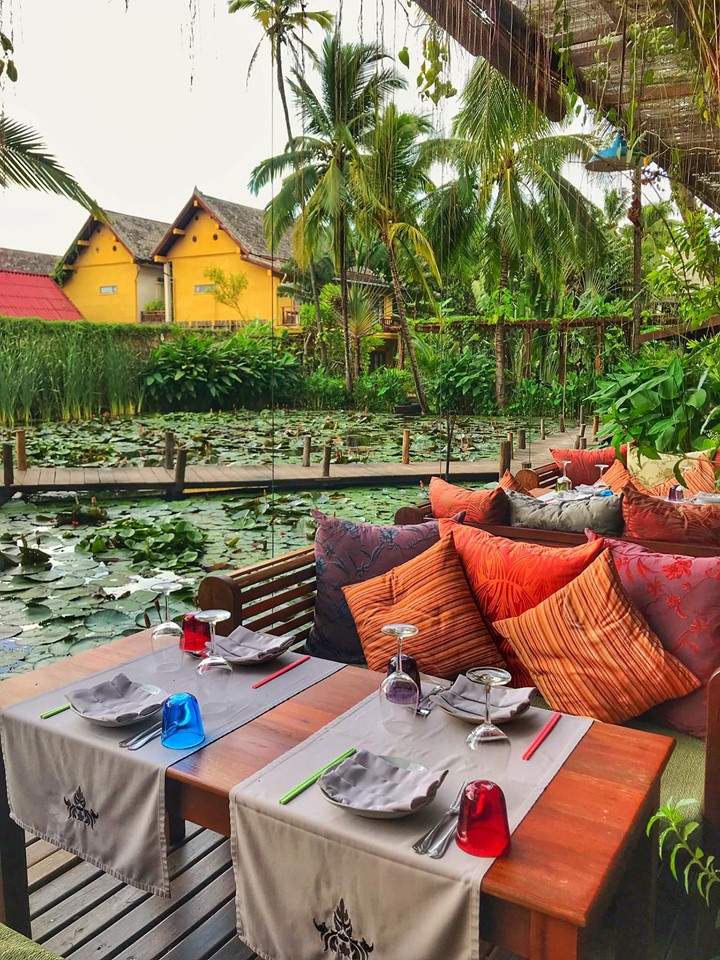 Ngậm ngùi buồn rầu không xem được lễ khất thực, mình qua Manda de Laos ăn sáng cho vơi nỗi buồn. Trời vẫn tiếp tục mưa cho tới tận lúc mình ăn sáng, buổi sáng ở đây không khí cực thích, không gian yên tĩnh không một tiếng ồn, kể cả tiếng lạch cạch bát đĩa dao dĩa cũng ý tứ cực kì. Manda de Laos có lẽ đẹp nhất vào buổi sáng tới trưa, vì đây là thời điểm hoa súng nở bung hết cả, siêu siêu đẹp (chiều qua mình tới không thấy bông súng nào nở tưởng đã hết mùa rồi nên hơi thất vọng, sáng hôm sau thấy cả một đầm hoa súng bung lụa, kể từ đó mới biết hoa súng chỉ nở vào buổi đêm và sáng sớm). Đồ ăn sáng ở đây không có quá nhiều món nhưng cũng đủ ăn, có cả đồ Âu và đô Á, khẩu vị khá hợp với mình, ngồi ăn sáng ngắm view đầm hoa súng, ngửi mùi mưa và nghe tiếng mưa rơi tí tách, thêm một ít nhạc du dương nhẹ nhàng, Luangprabang ở đâu cũng vậy, luôn là 10 điểm cho không gian vì quá đỗi bình yên.