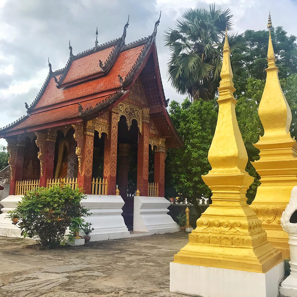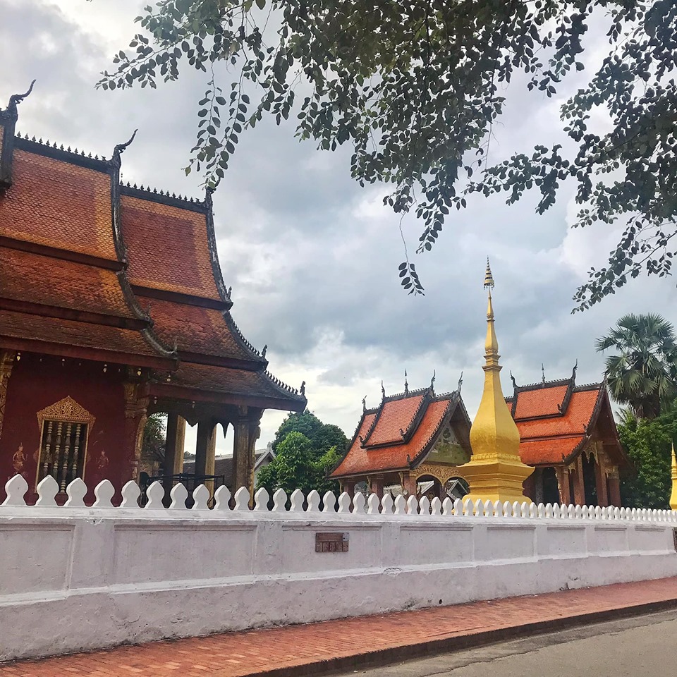Chờ đỡ nắng một chút, mình bắt đầu di chuyển chạy dọc đi thăm thú các chùa. Ở đây siêu nhiều chùa, một dọc đường phải có tới 4-5 ngôi chùa liền nhau san sát, kiến trúc thì hầu như đều giống nhau, chỉ nhớ một ngôi chùa tên Wat Sop Sickharam và một ngôi là Wat Syrimoungkoun Xaiyaram (type tên thôi cũng loá hết mắt). Thời điểm mình đi vào khoảng 15h, lúc này thấy các nhà sư đang rung chuông, cả mấy chùa liền đều vậy, mình cũng không rõ rung chuông vào khung giờ này có ý nghĩa gì nữa. Thêm một điều đặc biệt nữa là đường phố Luangprabang có rất nhiều những con ngõ nhỏ nhỏ mà xinh xắn cực kì, xinh đẹp từ từng viên gạch đến tán cây, đi một dọc phố đứng mỗi ngóc ngách chụp một kiểu ảnh ra về có khi cũng được một bộ ảnh sống ảo nghìn like rồi.