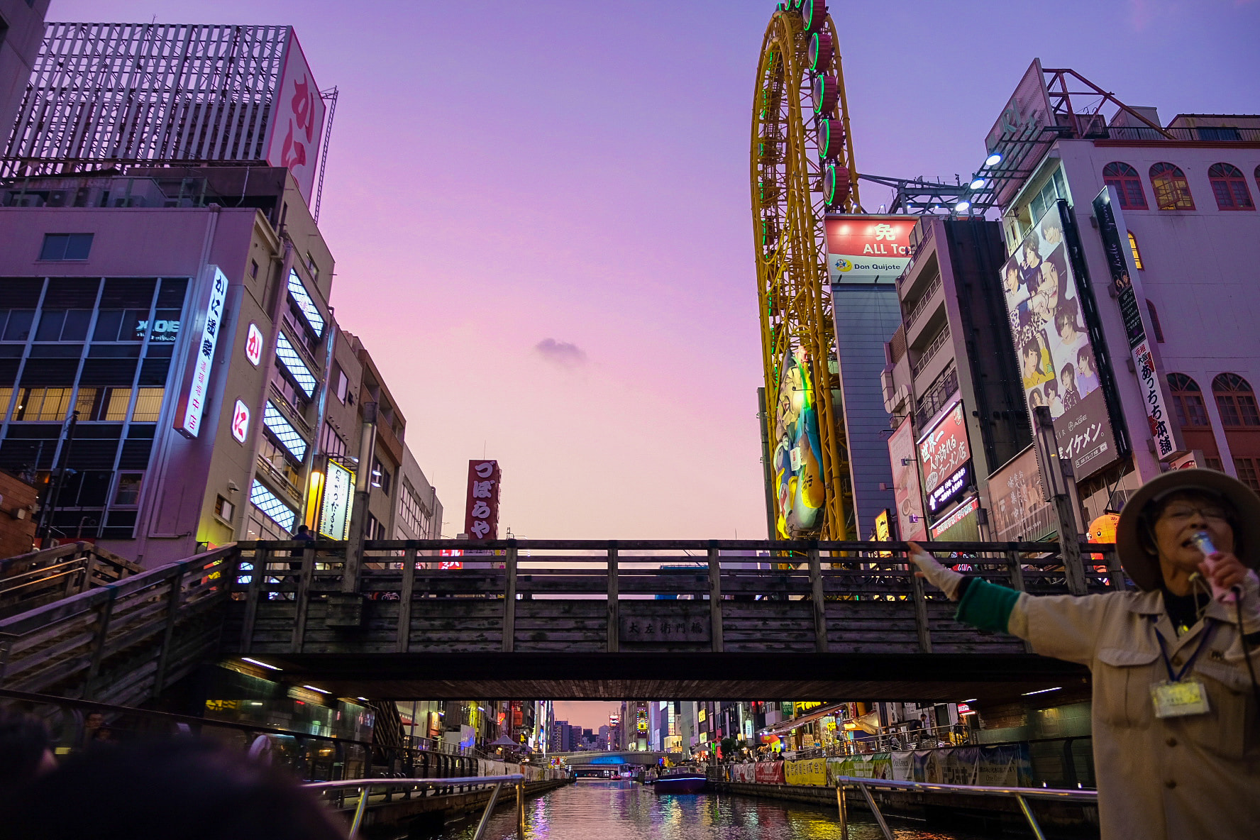 Ăn xong thì đi dạo và shopping. Sử dụng vé Osaka Amazing Pass đổi vé tàu miễn phí đi dọc sông ngắm “quàng hôn”. Mình thấy có 2 loại tàu lớn và bé, tàu lớn chứa khoảng 40 người. Tàu nhỏ chứa khoảng 20 người. Mình đi tàu nhỏ, có cô hướng dẫn viên rất dễ thương. Cô có một cuốn sổ nhỏ ghi lại các câu nói thông dụng theo ngôn ngữ của các nước. Cô hỏi tụi mình Xin chào và Cảm ơn bằng tiếng Việt thế nào và ghi chép rất cẩn thận. Mặc dù ngôn ngữ cô sử dụng để giới thiệu là tiếng Nhật, tụi mình không hiểu gì hết. Nhưng thông qua ngữ điệu và sự dễ thương của cô thì tụi mình cảm thấy rất thích. Đặc biệt cô hát rất hay.