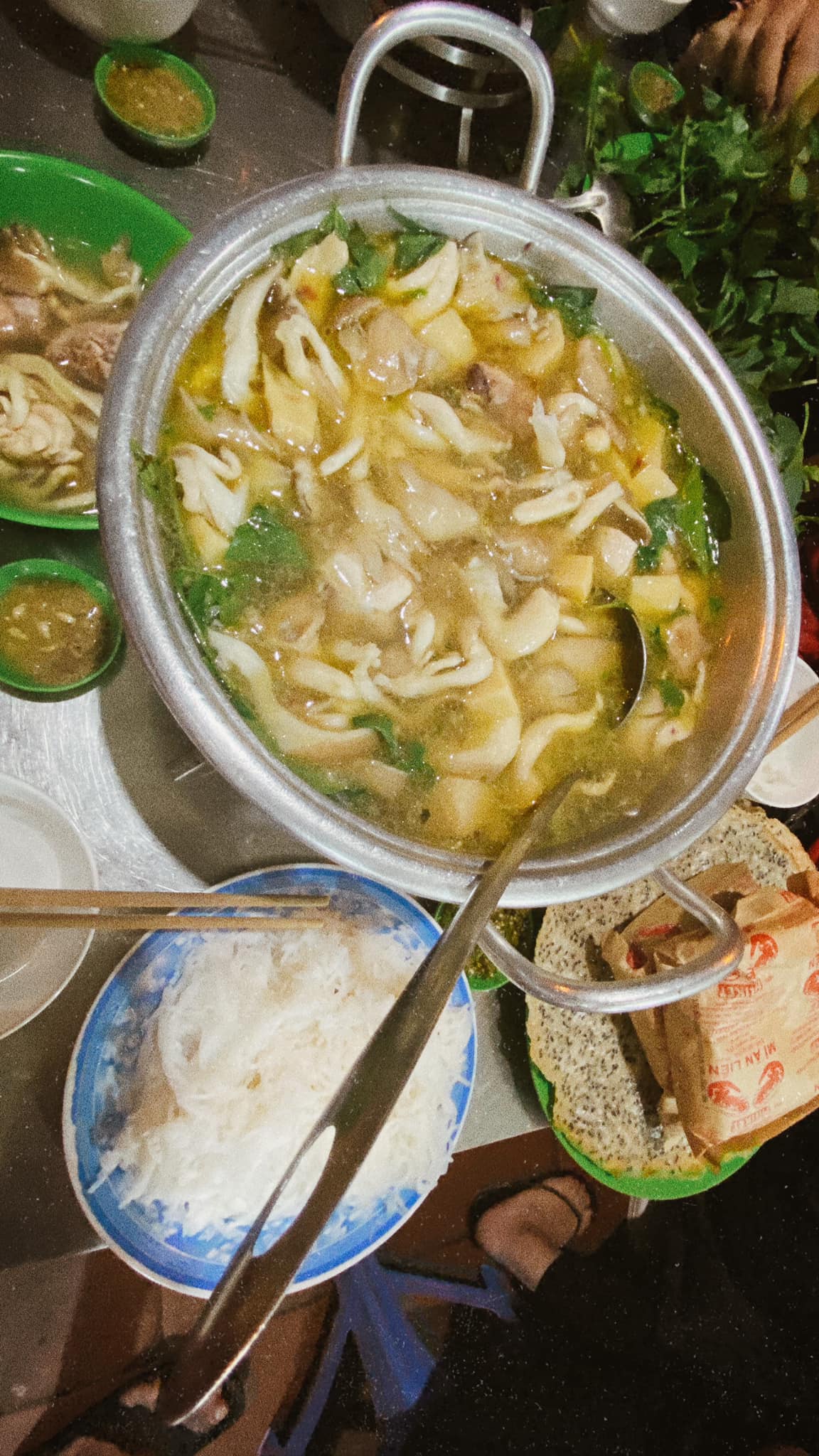 𝗔̆𝗻 𝘁𝗼̂́𝗶 – 𝗹𝗮̂̉𝘂 𝗴𝗮̀ 𝗹𝗮́ 𝗲́ 𝗧𝗮𝗼 𝗡𝗴𝗼̣̂ (5 đường 3 tháng 4): quán cực đông, đứng xếp hàng hơi bị lâu mới có chỗ cho 2 người. Mình gọi 𝗣𝗵𝗮̂̀𝗻 𝟮𝟬𝟬𝗸/𝟮 𝗻𝗴𝘂̛𝗼̛̀𝗶 𝗮̆𝗻, lần nào cũng ráng ăn cho hết nhưng vẫn còn dư (dư “thịt gà giả” và nước lẩu)