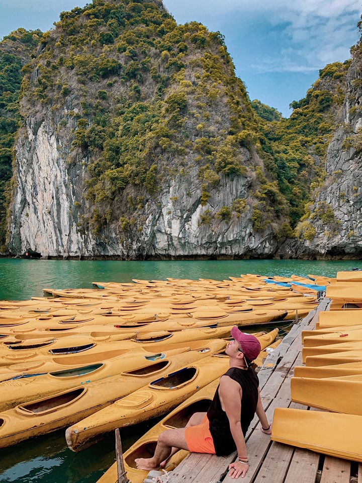Ngày 2: 5 rưỡi sáng dậy đón bình minh. Tầm 6h15 có tập thể dục buổi sáng Thái Cực Quyền trên sân thượng tầng 4. Từ 6h sáng đến 7h15 sẽ có ăn sáng nhẹ tại tầng 3. Có thể mang bánh và trà vào phòng hoặc lên tầng thượng ăn. Theo thông báo đúng 7h15 có mặt tại tầng 1 để đi thăm Hang Sáng Tối. Sẽ phải đăng ký trước từ tối hôm trước là muốn đi bằng thuyền nan hoặc chèo kayak. Mình thì đăng ký đi bằng kayak. Khi xuống cano ai cũng phải mặc áo phao, cano sẽ chở ra một cái bè gần Hang Sáng Tối để bắt đầu chèo từ đó, ai đi thuyền nan thì cũng tập trung cho đủ thuyền rồi có người chèo chở vào hang. Một kayak sẽ đi 2 người. Nếu ai không biết chèo kayak thì sẽ hơi khó khăn đó nha vì phải chèo cả đi lẫn về và phải biết điều chỉnh kayak đó.