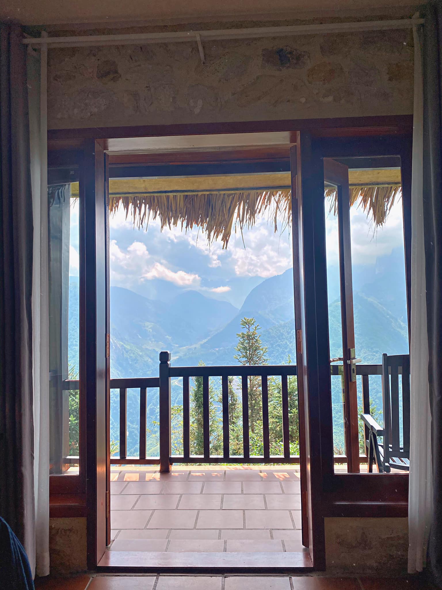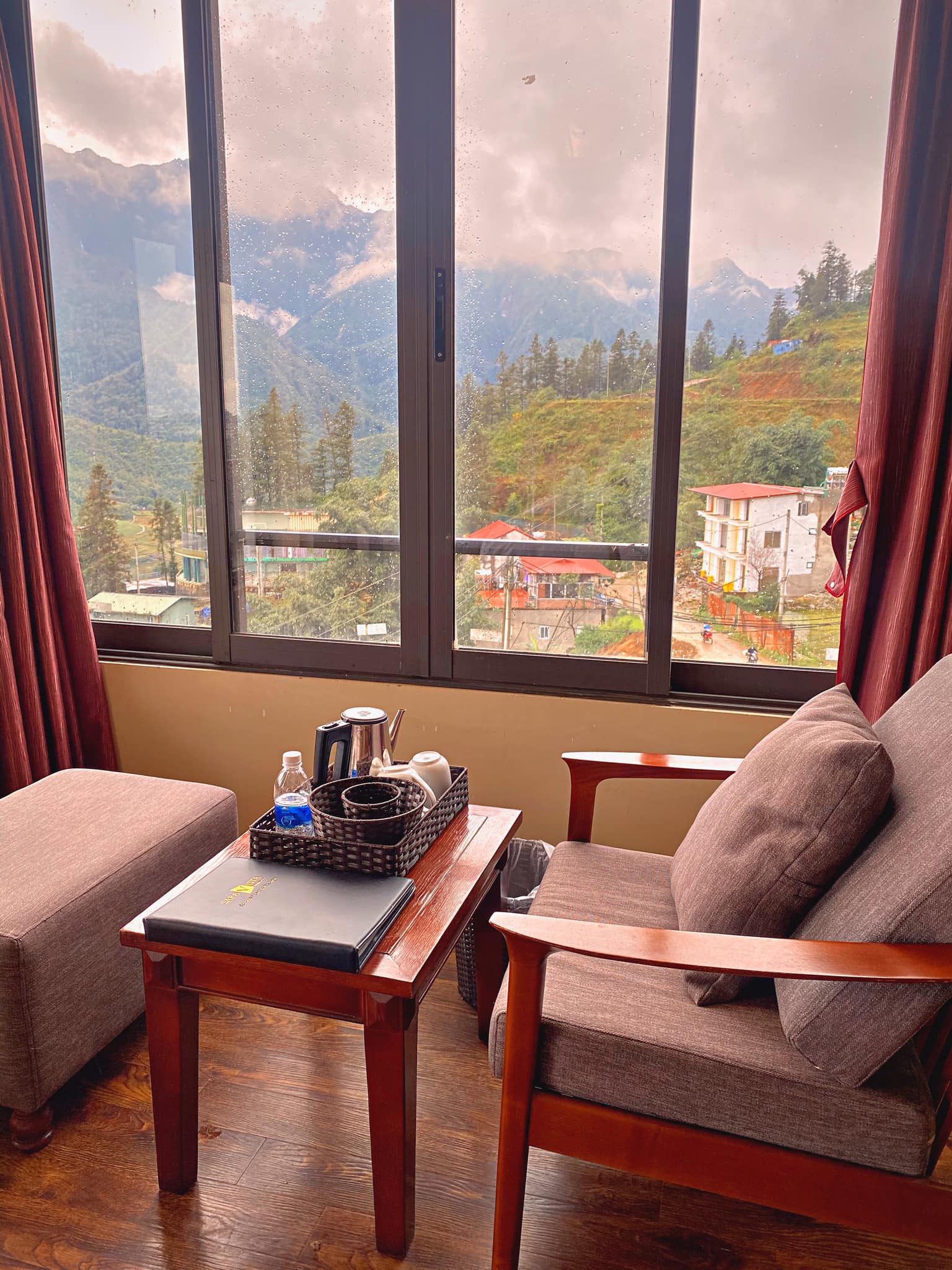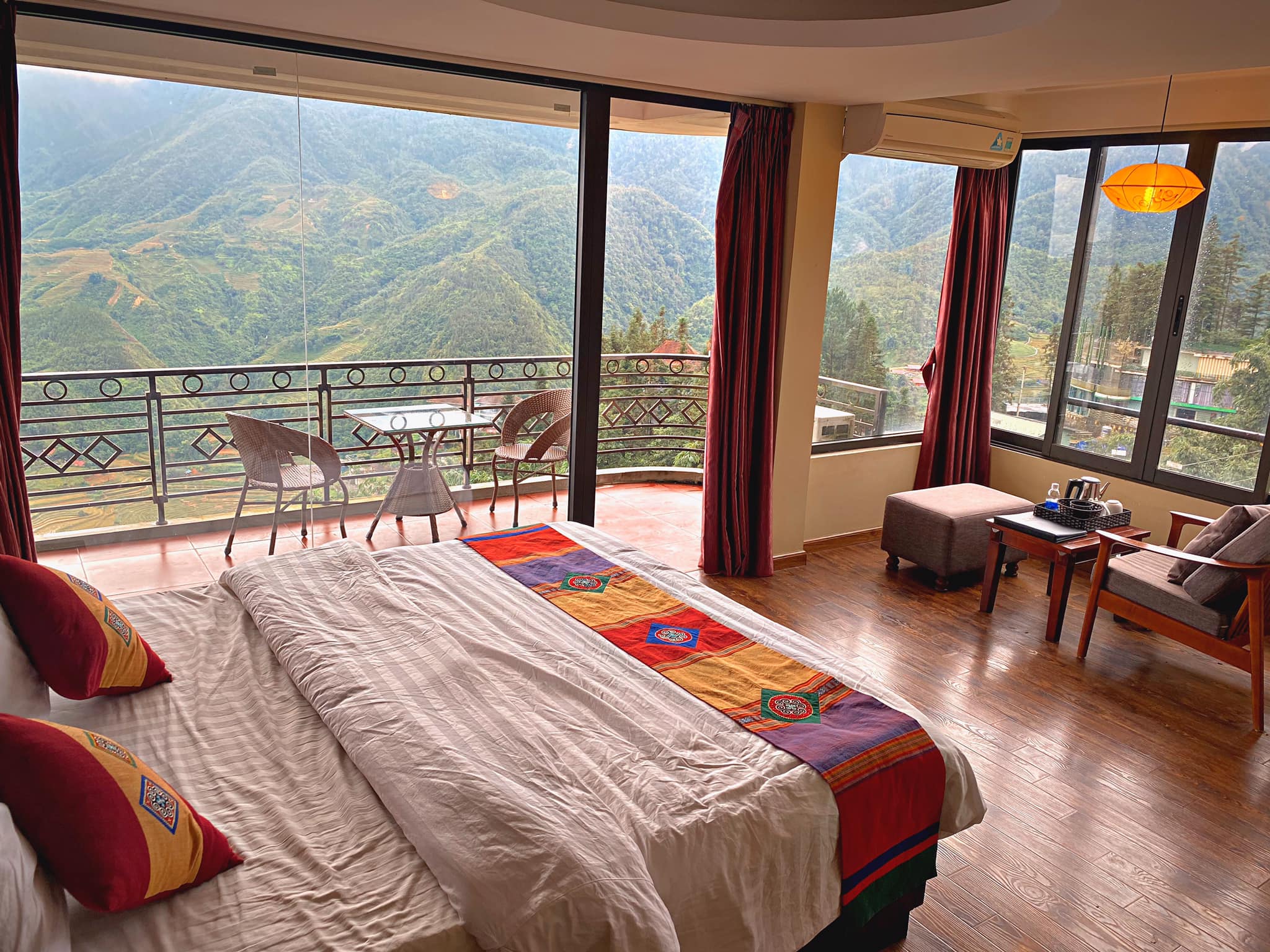 Xe buýt bên Topas đưa bọn mình đến trung tâm đi ngang KS mình ở luôn là Sapa Vista Hotel. Mình đặt phòng dạng thường view khung kính qua combo nhưng hôm đó phòng mình máy lạnh bị hư nên may mắn được bên khách sạn chuyển mình lên phòng hạng Vip nhất luôn. Phòng rộng dã man. Mình ở trên tầng 6 nên nhìn được trọn view ở trước ban công.