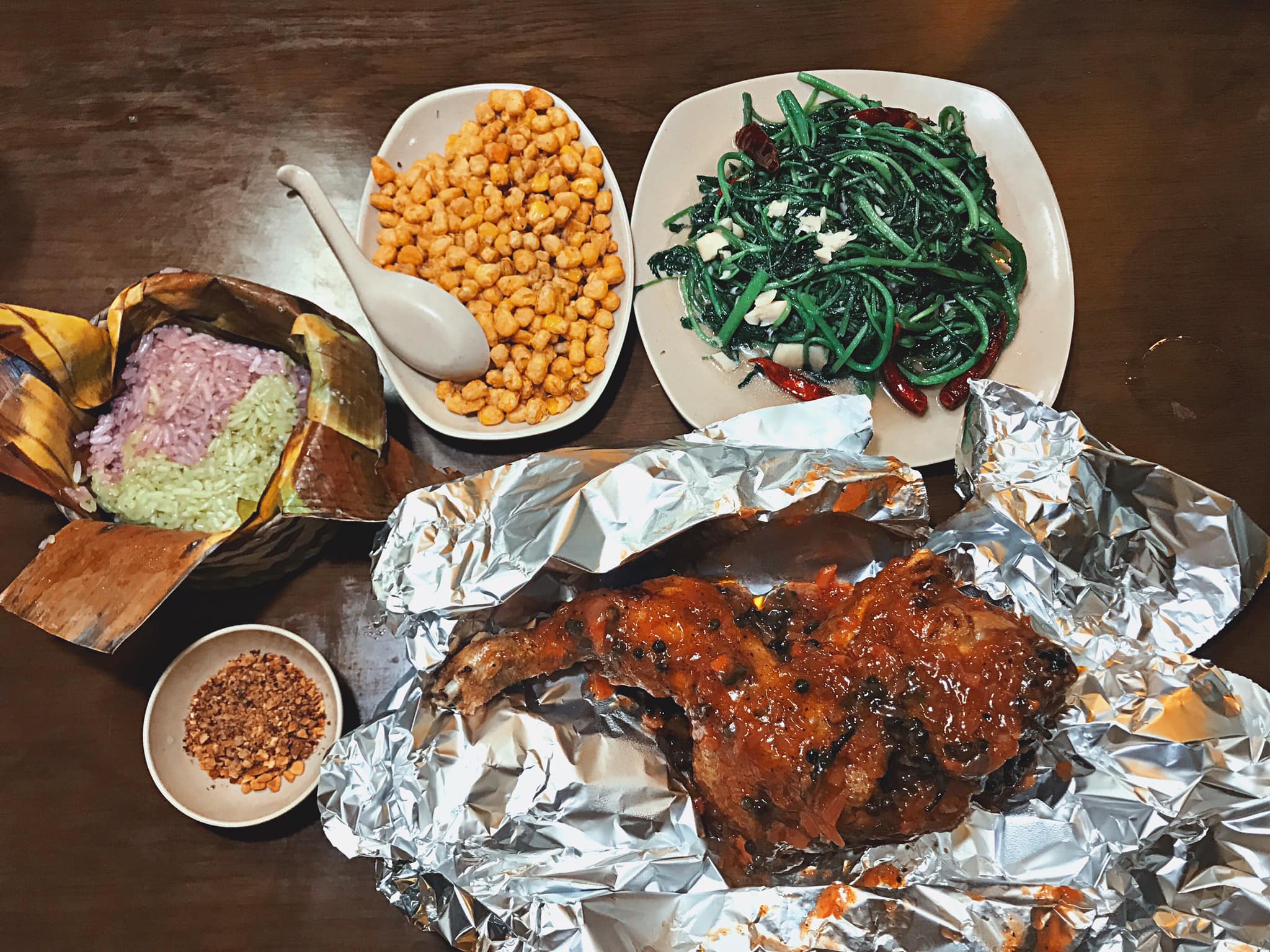 Hotpot Center: 71 Xuân Viên. Ở đây có lẩu cá tầm, cá hồi cũng ngon nhưng lần này mình chọn ăn gà vì mọi người cũng đã recommend gà nướng tiêu xanh ở đây rất nhiều. Mình gọi Combo nửa con gà nướng tiêu xanh ăn kèm xôi muối vừng và rau rừng theo mùa 2 người ăn no ứ hự.