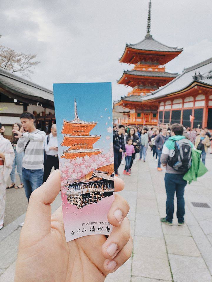 Tuy nhiên, điều mình buồn nhất khi bước vào trong đó là sảnh chính đang được quây kín lưới để trùng tu và mùa đẹp nhất để tham quan Kiyomizu-dera là mùa thu lá đỏ. Do đó, nếu bạn đi mùa này thì có thể bỏ qua địa điểm này nếu không muốn ra về tay không. Thôi thì không ngắm được cảnh thật, bạn có thể ngắm những bức hình được đóng khung treo to đùng trong điện, mình cũng cố vớt vát chụp lại 1 tấm để làm động lực phục thù vào dịp khác nếu có cơ hội quay lại Kyoto.