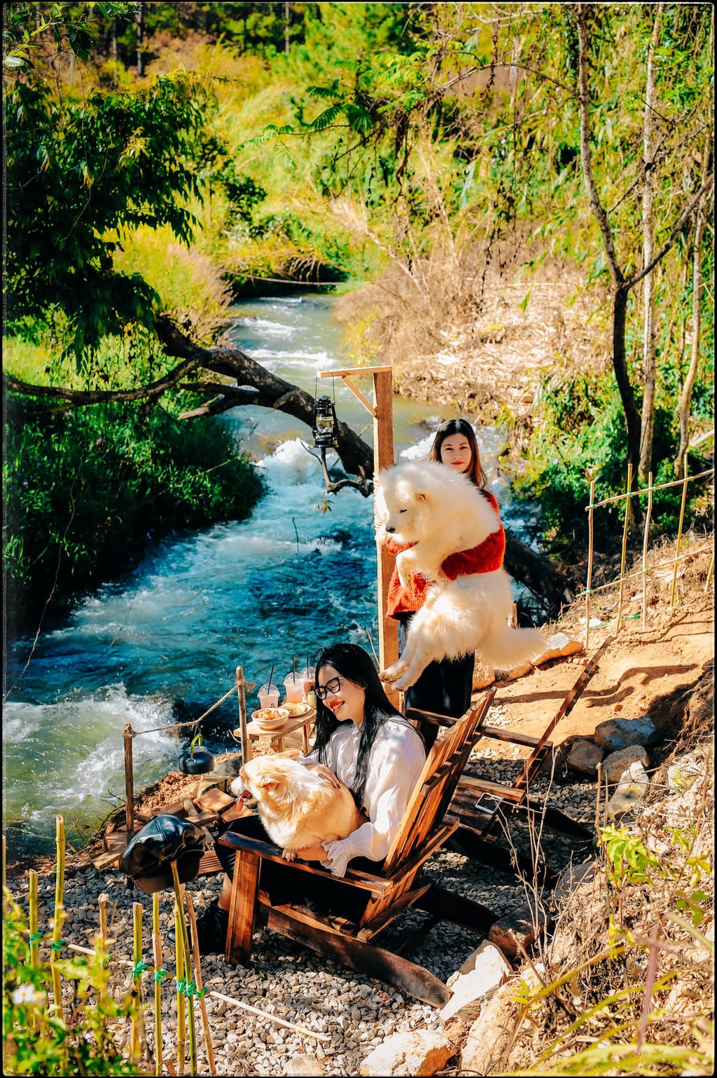Nếu thuộc tuýp yêu thích động vật, Nhà của DOG garden là quán cà phê bạn không nên bỏ qua khi đến Đà Lạt. Tuy chỉ mới mở cửa, địa chỉ này đã liên tục được dân cư mạng nhắc tên trên các diễn đàn du lịch nhờ không gian cực chill và dàn “nhân viên 4 chân” thân thiện. Không gian rộng, gần gũi với thiên nhiên là điểm mạnh của quán. Đến đây, bạn có thể cùng những chú chó nhâm nhi cà phê bên bờ suối, rừng thông và ngắm hoàng hôn xuống trong không gian bình yên. Ảnh: Đồng Ngô.