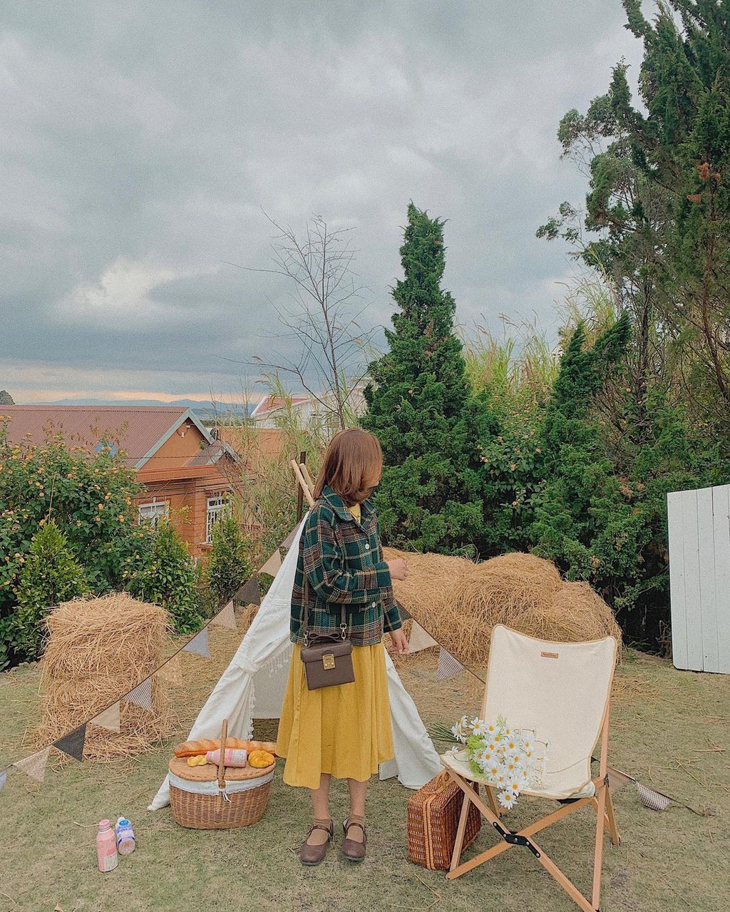 Bên cạnh những góc sống ảo trong nhà, ngoài trời là không gian cắm trại, bố trí lều, thảm picnic, ghế gỗ để bạn có thể lên hình. Khuôn viên quán trồng nhiều loại hoa phục vụ khách tham quan, chụp ảnh. Quán mở cửa từ 8-17h với giá vé 90.000 đồng/người. Địa chỉ: Trịnh Hoài Đức, phường 11, Đà Lạt. Ảnh: Yooberi, ngocbui98.