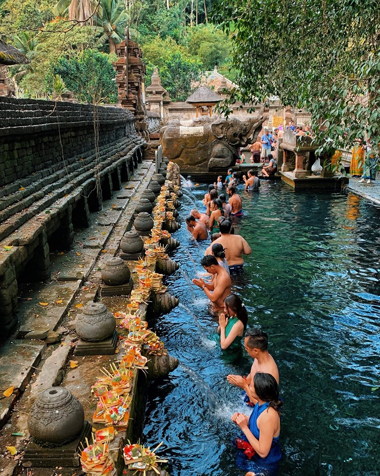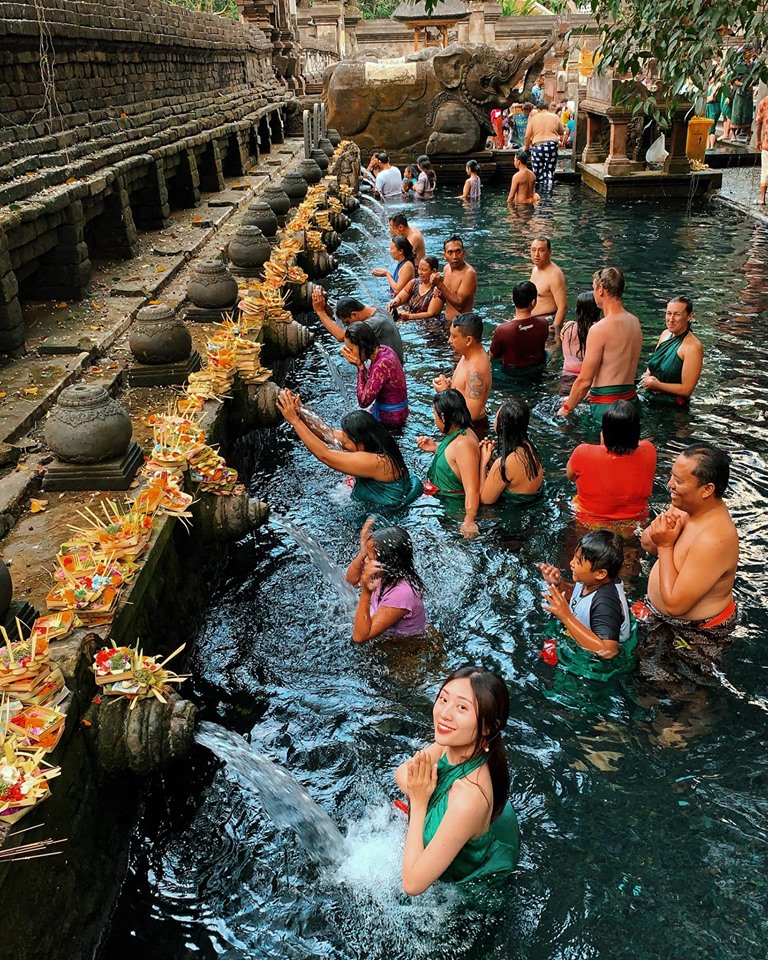 Đền Tirta Empul: Ngôi đền này nổi tiếng với việc tắm suối thiêng. Tại đây các bạn mua vé vào cổng giá 50k rupiah/ người, sau đó sẽ được phát một chiếc sarong (bắt buộc) để mặc và tham quan. Nếu các bạn muốn tắm suối thiêng cầu nguyện thì phải thuê sarong khác để tắm vì sarong ban đầu được phát không được phép xuống nước. Giá thuê sarong tắm suối thiêng là 10k rupiah.