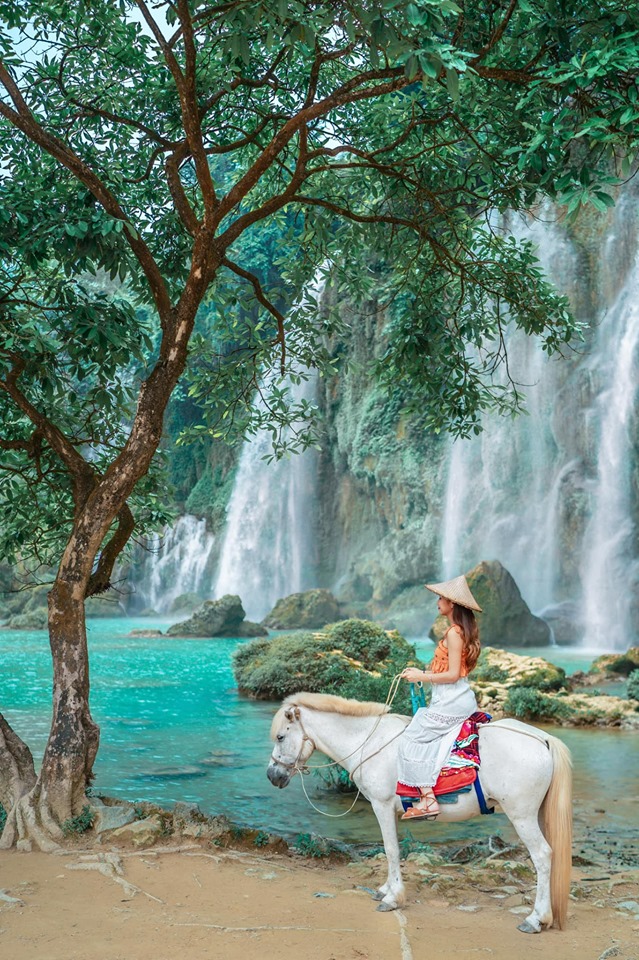 Màu nước ở thác xanh trong như ngọc, đẹp lắm, mình đã hiểu tại sao nhất định phải đến thác Bản Giốc khi du lịch Cao Bằng rồi. Lúc mình đến nơi khoảng 1 rưỡi chiều, đập thủy điện bắt đầu ngăn bớt nước lại rồi, chứ tầm 11h-1h đập thủy điện xả nước thì thác nhiều nước hơn, đẹp hơn nữa. À, con thác này là của chung 2 nước mình và TQ nha, mình 1 bên nó 1 bên, nhưng bên mình có thêm con thác phụ và đồng cỏ nguyên sơ, đẹp hơn bên nó nhiều luôn.