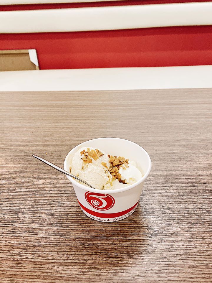 Uống cafe ở The Married Beans xong thì tụi mình về khách sạn nghỉ ngơi + tiễn 1 chị trong team đi về. Về ngủ trưa 1 chút thì dậy để di ăn bữa chiều là nem nướng, ăn xong nem nướng vẫn thấy nhạt miệng nên đi ăn kem bơ /tự dưng quên tên quán nhưng quán xinh lắm nha. Gọi 2 li kem bơ hết 118k chắc dùng bơ 034 và có cả bơ cục trên mỗi li nên giá cao chăng? Điểm trừ là bơ bị dây nha nếu là mình mua ăn mình sẽ mắng dzốn người bán liền và không bán cho khách đâu.