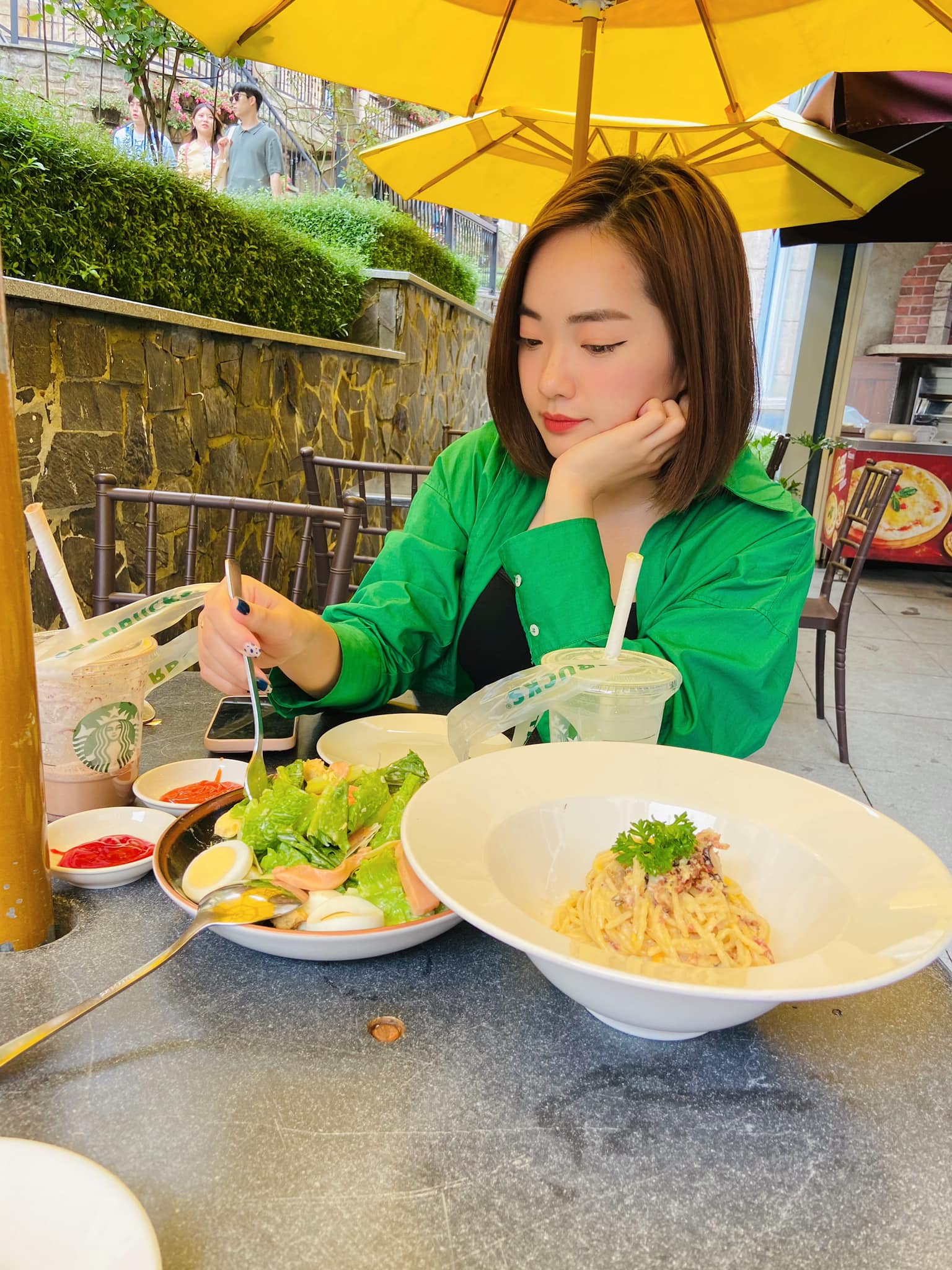 Về ăn uống thì em không chọn gói buffet khi mua vé vì em không thích ăn buffet vừa đông vừa không ngon nên em tới nhà hàng Brasserie ăn trưa (1 phần salad cá hồi, 1 mì carbonara hết khoảng 420k, 2 người ăn no căng). Starbucks Bà Nà Hills có view và concept decor cũng rất xinh nha.