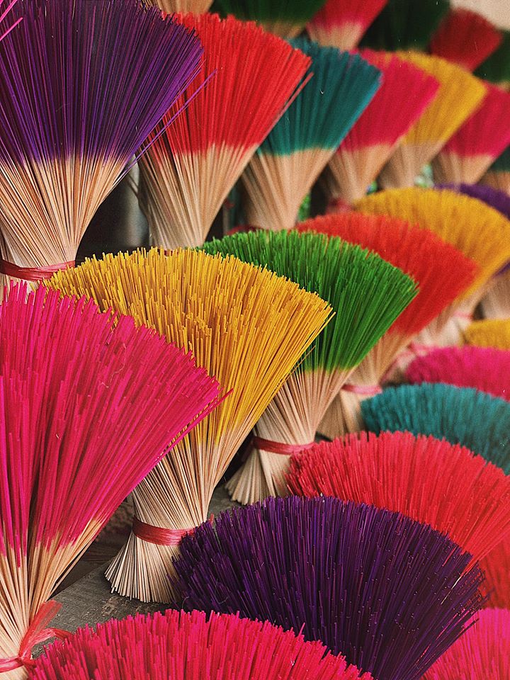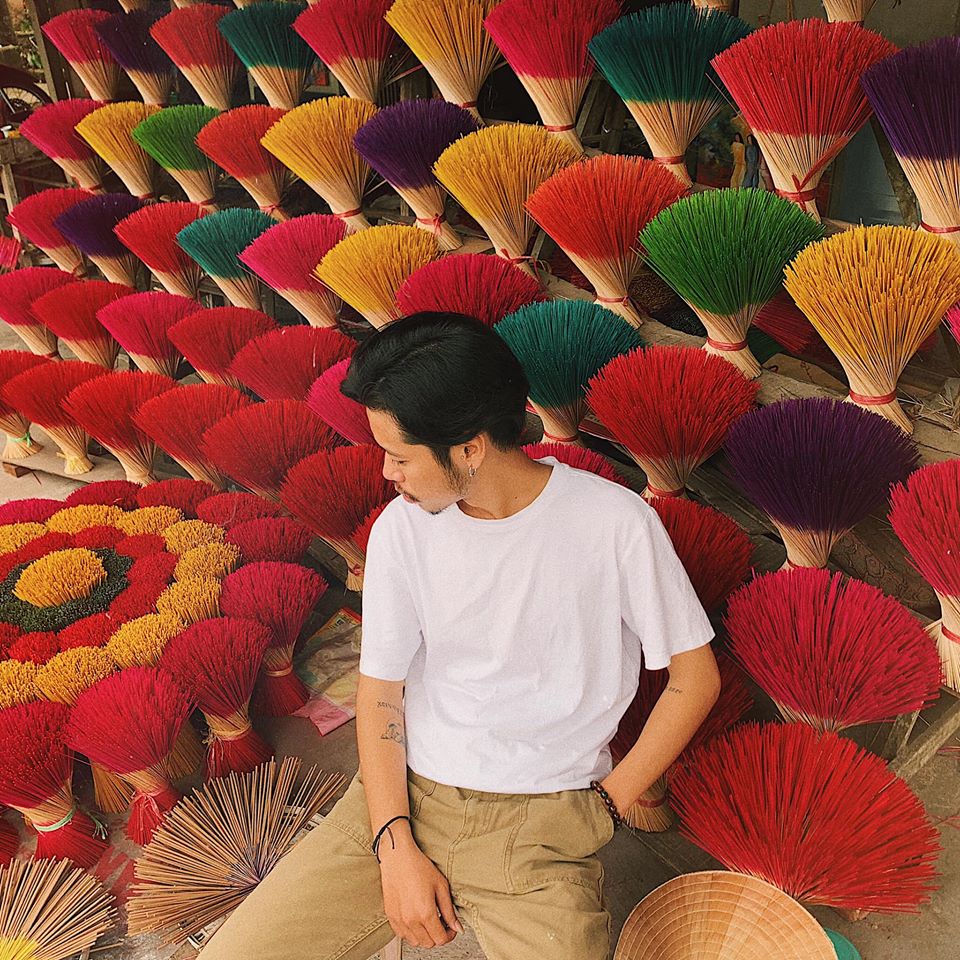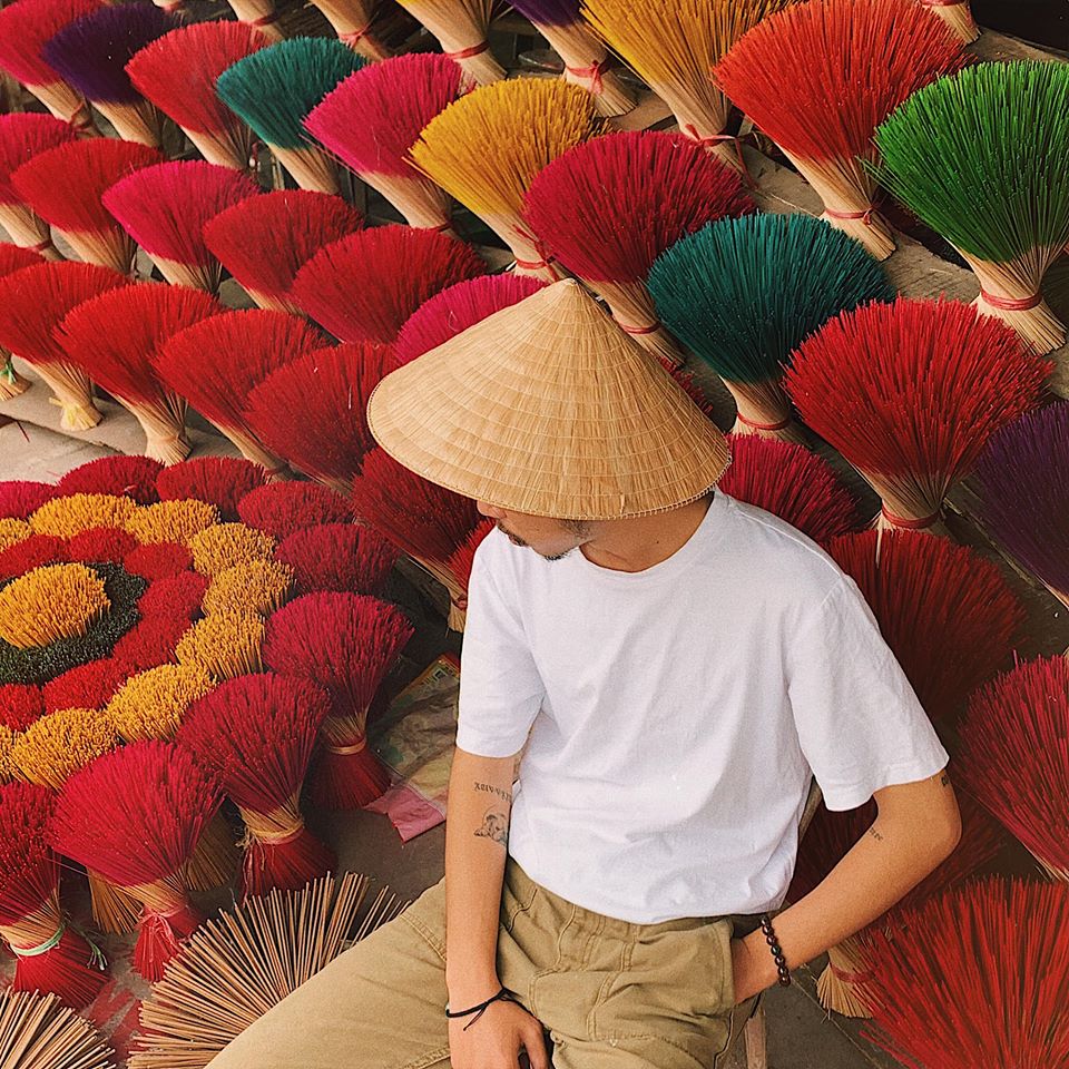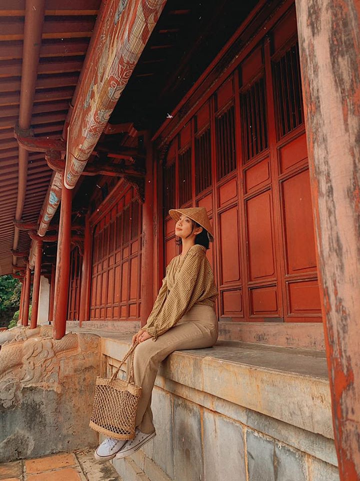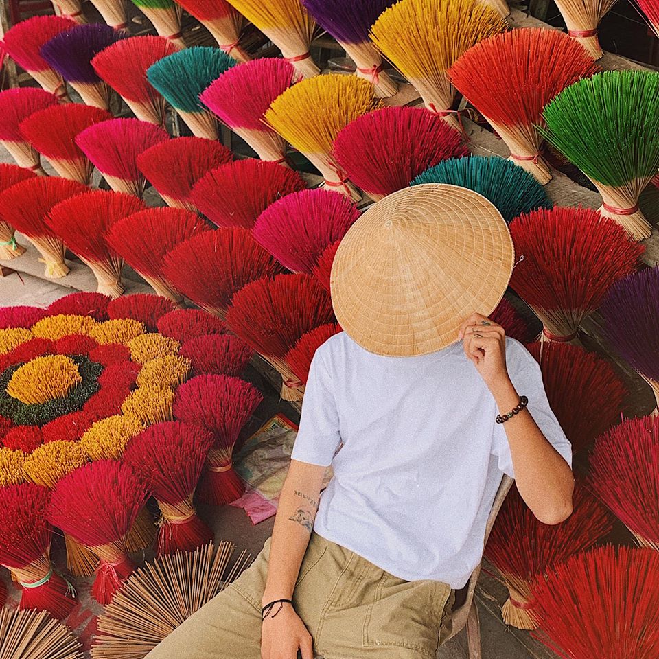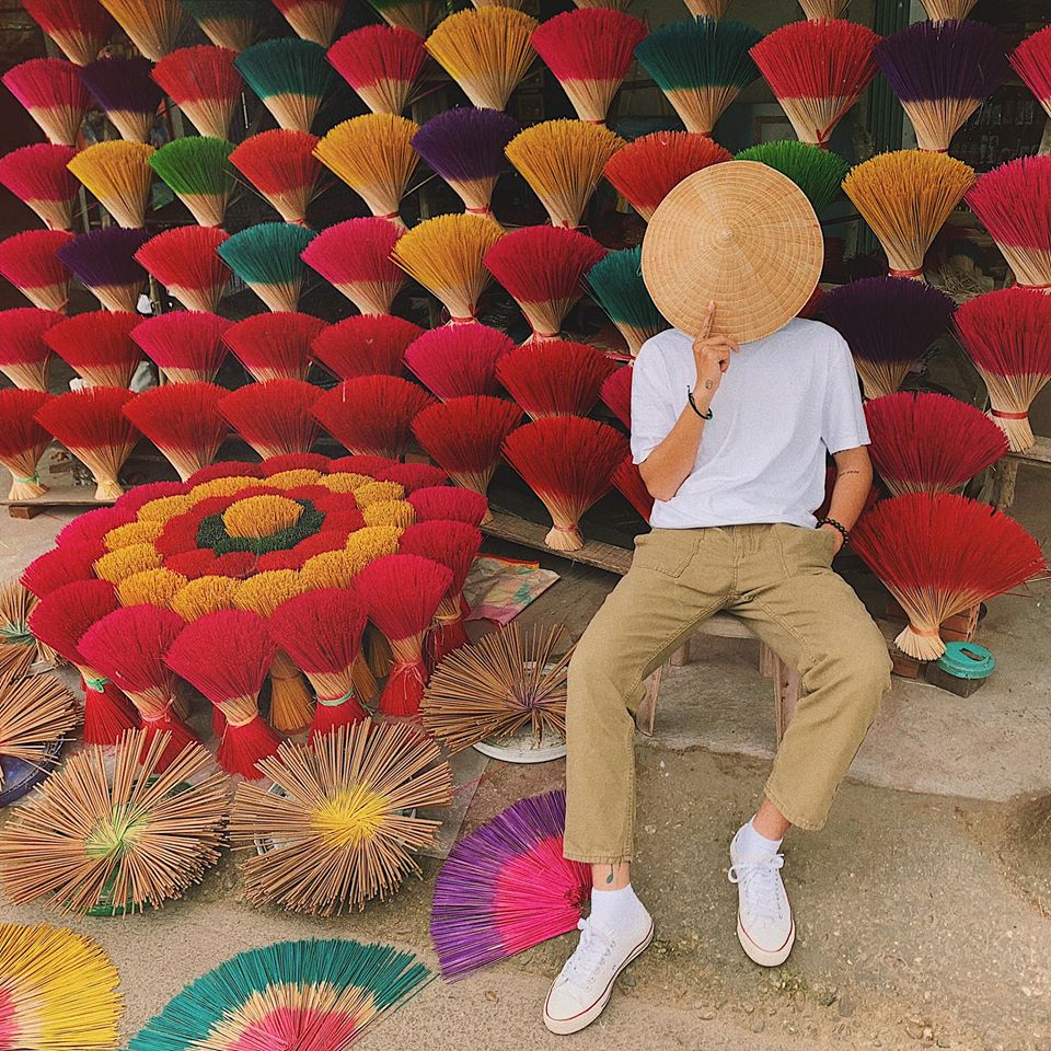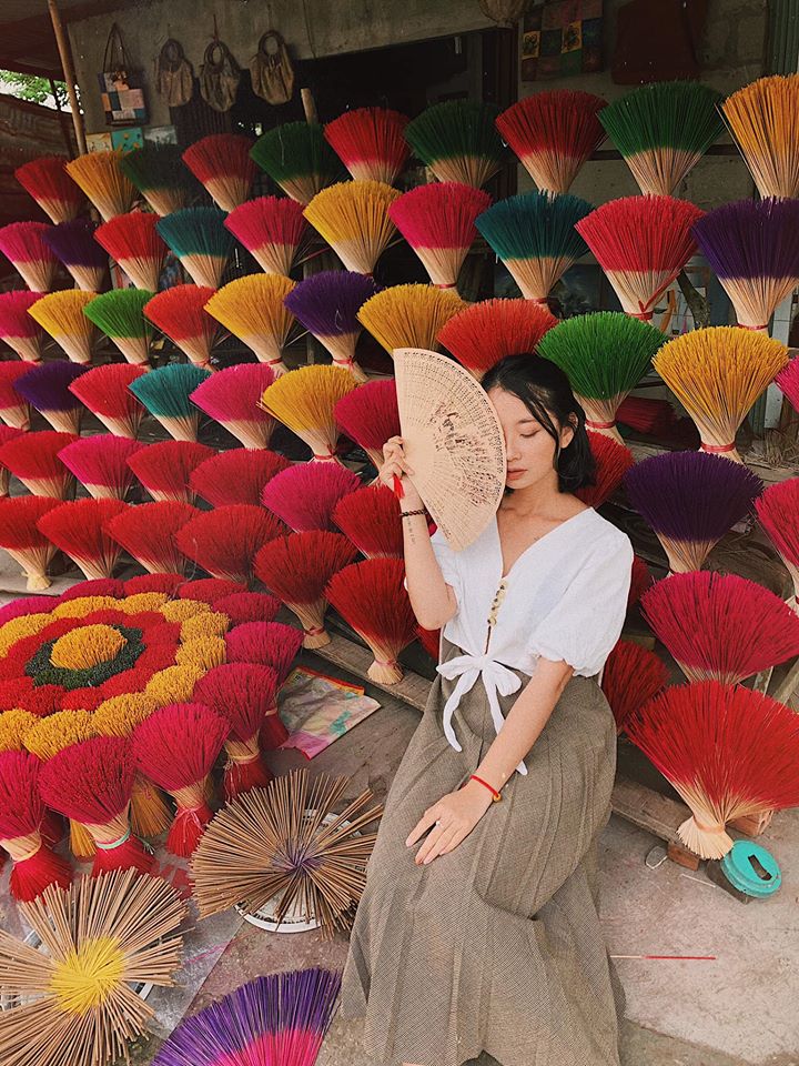 Vì là ngày cuối rồi nên tụi mình đi những điểm gần để tiện di chuyển hơn. Sáng sớm sau khi ăn sáng tụi mình ghé Làng Hương Thuỷ Xuân trên đường Huyền Trân Công Chúa (cách tttp khoảnh 6km). Hai bên đường có rất nhiều các quán bày bán Hương với đủ các màu sắc, nhưng tụi mình lại ấn tượng với quán Hương của Mệ Tuyết (đối diện 82 Huyền Trân Công Chúa). Quán của Mệ một mình một bên đường, có view rộng rãi chụp hình đẹp và thoải mái. Tụi mình bị ấn tượng mạnh với Mẹ Tuyệt người gầy nhỏ nhỏ, khuôn mặt hiền hậu. Mệ đúng chuẩn người con gái Huế xưa chính gốc: hiền dịu và dễ mến, giọng nói nhẹ nhàng, cuốn hút. Mệ rất nhiệt tình và hiếu khách luôn ý tụi mình được mệ mời ăn bánh đậu xanh, mứt Huế và kể cho nghe về Huế. Mệ để cho chụp hình thoải mái rồi còn cho mượn cả quạt với hương để làm phụ kiện chụp cùng, còn cho 2 đứa mượn ghế để đứng lên chụp cho hình có góc đẹp nữa… dễ thương quá mà. Với mình thì ảnh ở đây đẹp và ấn tượng nhất trong chuyến đi lần này.