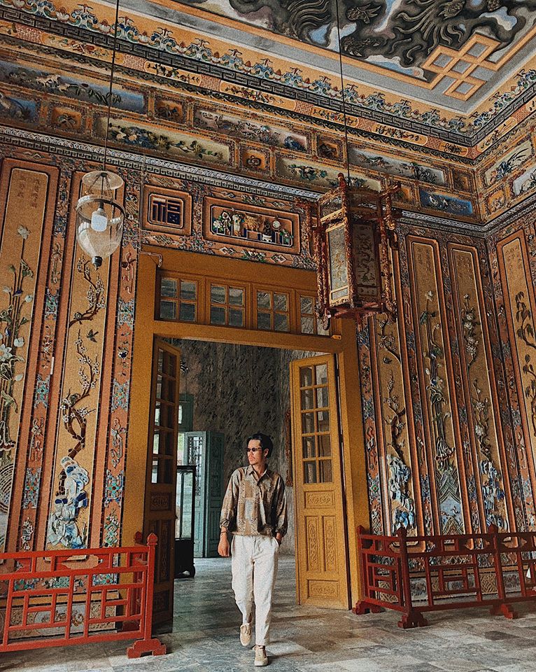 Điểm đầu tụi mình ghé là Lăng Khải Định – công trình kiến trúc cuối cùng của triều Nguyễn và cũng là công trình nổi bật nhất trong tất cả những lăng tẩm khác nhờ sự giao thoa của hai nền văn hoá Đông – Tây. Tới đây bạn sẽ choáng ngợp bởi kiến trúc từ ngoài vào trong vô cùng độc đáo và thu hút. Sẽ rất thiếu sót nếu các bạn không tham quan lăng Khải Định.