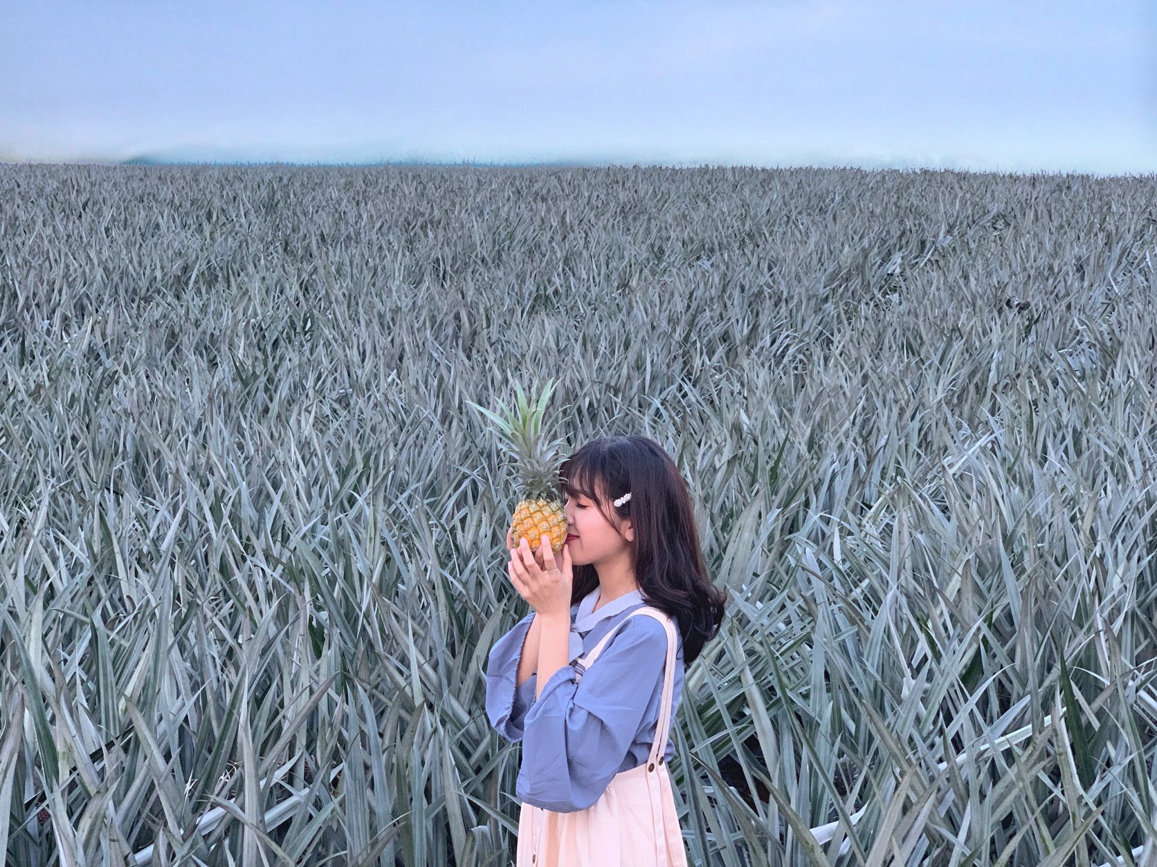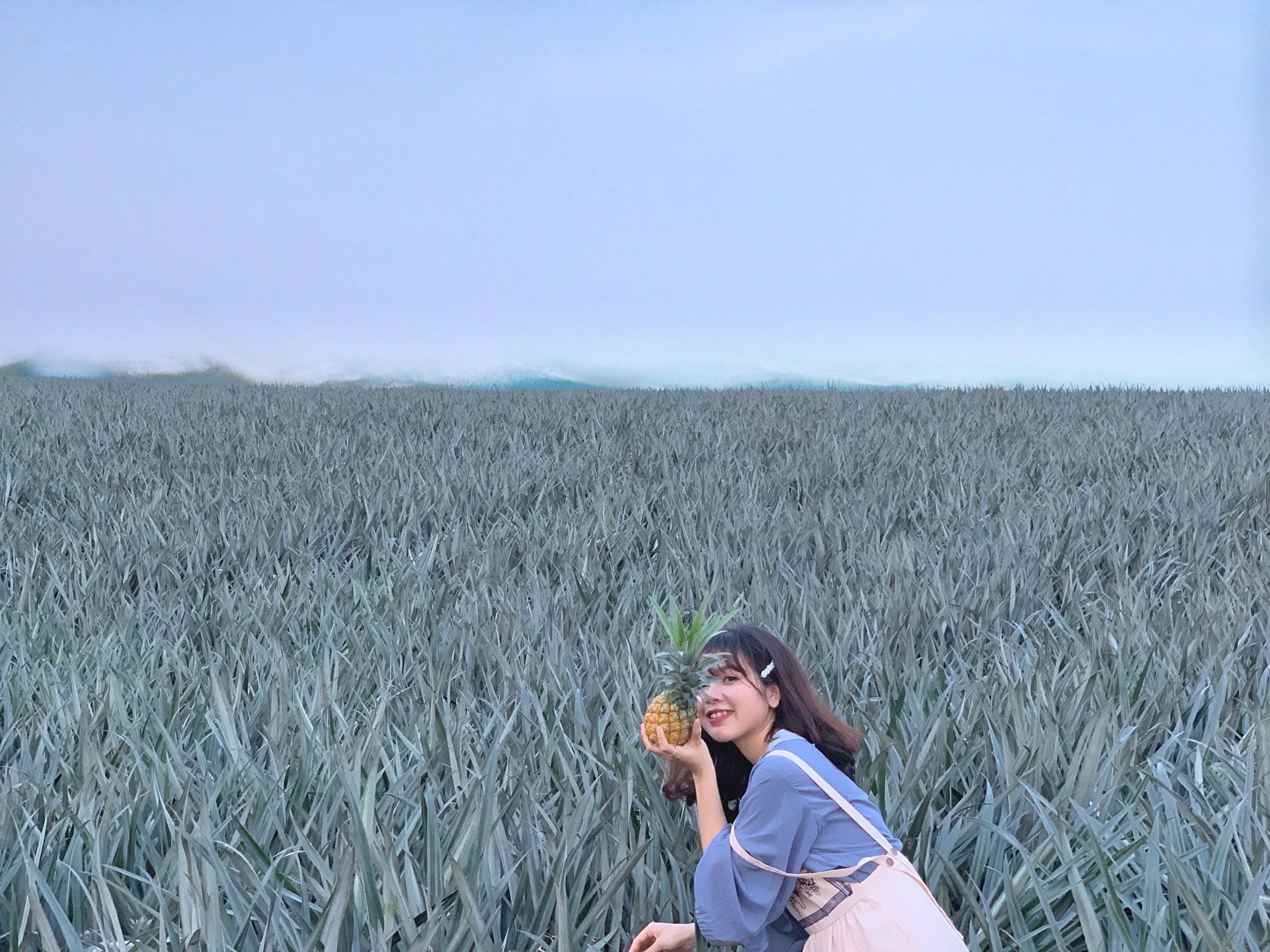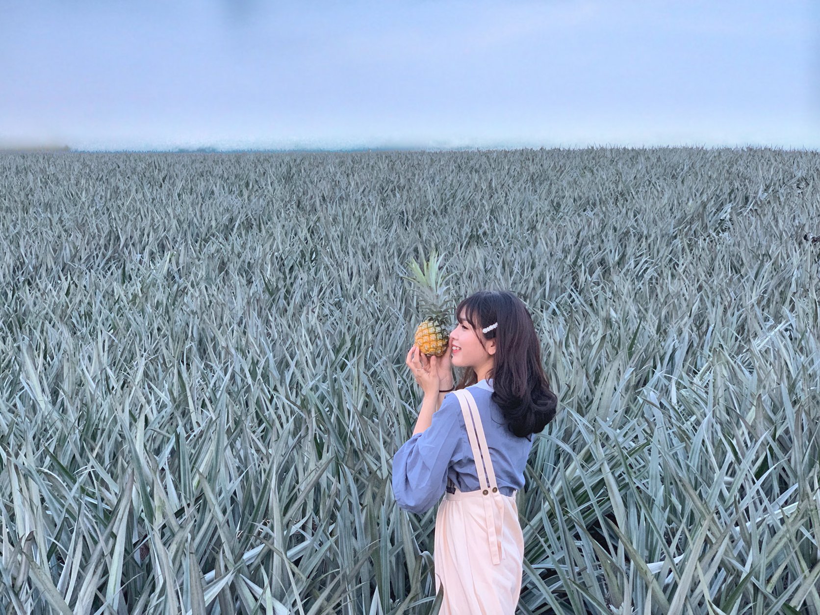 17h30 bọn mình ra cây trái tim chụp. Thực sự thì góc từ ruộng dứa lớn chụp đẹp hơn nhưng chắc nhiều ng chụp quá nên đã bị rào lại và ghi chữ “cấm vào ruộng” nên bọn mình phải chụp từ ruộng dứa ngắn, cảm thấy không được ưng cho lắm. Chụp xong cây trái tim bọn mình ra ruộng dứa đối diện để chụp thì bị bà chủ ra đứng quát “này không thấy chữ ở biển kia à”. Thế là bọn mình lùi lên trên ruộng dứa phía trên để chụp. Vừa chụp vừa sợ xem có bị ai ra quát không.