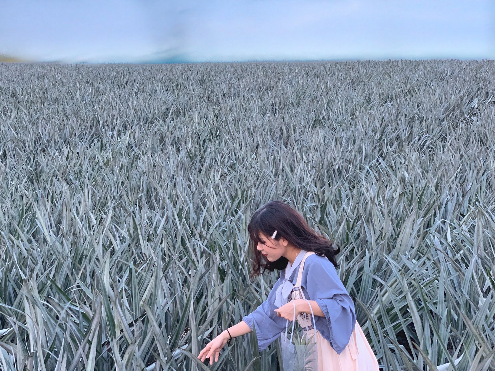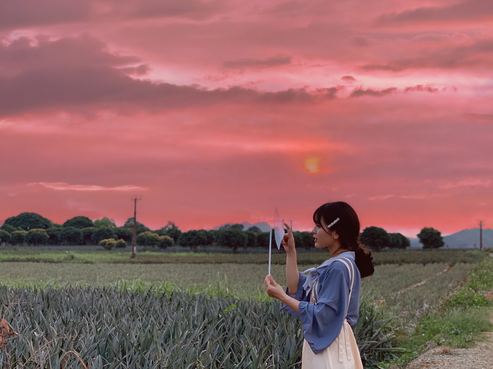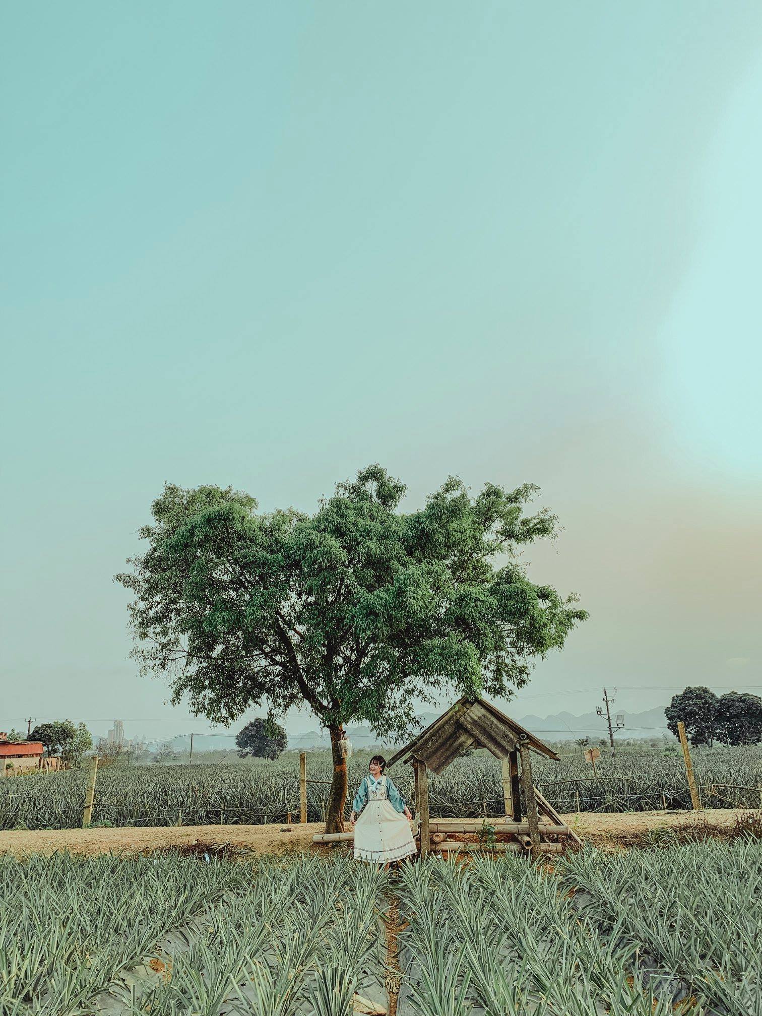 17h30 bọn mình ra cây trái tim chụp. Thực sự thì góc từ ruộng dứa lớn chụp đẹp hơn nhưng chắc nhiều ng chụp quá nên đã bị rào lại và ghi chữ “cấm vào ruộng” nên bọn mình phải chụp từ ruộng dứa ngắn, cảm thấy không được ưng cho lắm. Chụp xong cây trái tim bọn mình ra ruộng dứa đối diện để chụp thì bị bà chủ ra đứng quát “này không thấy chữ ở biển kia à”. Thế là bọn mình lùi lên trên ruộng dứa phía trên để chụp. Vừa chụp vừa sợ xem có bị ai ra quát không.