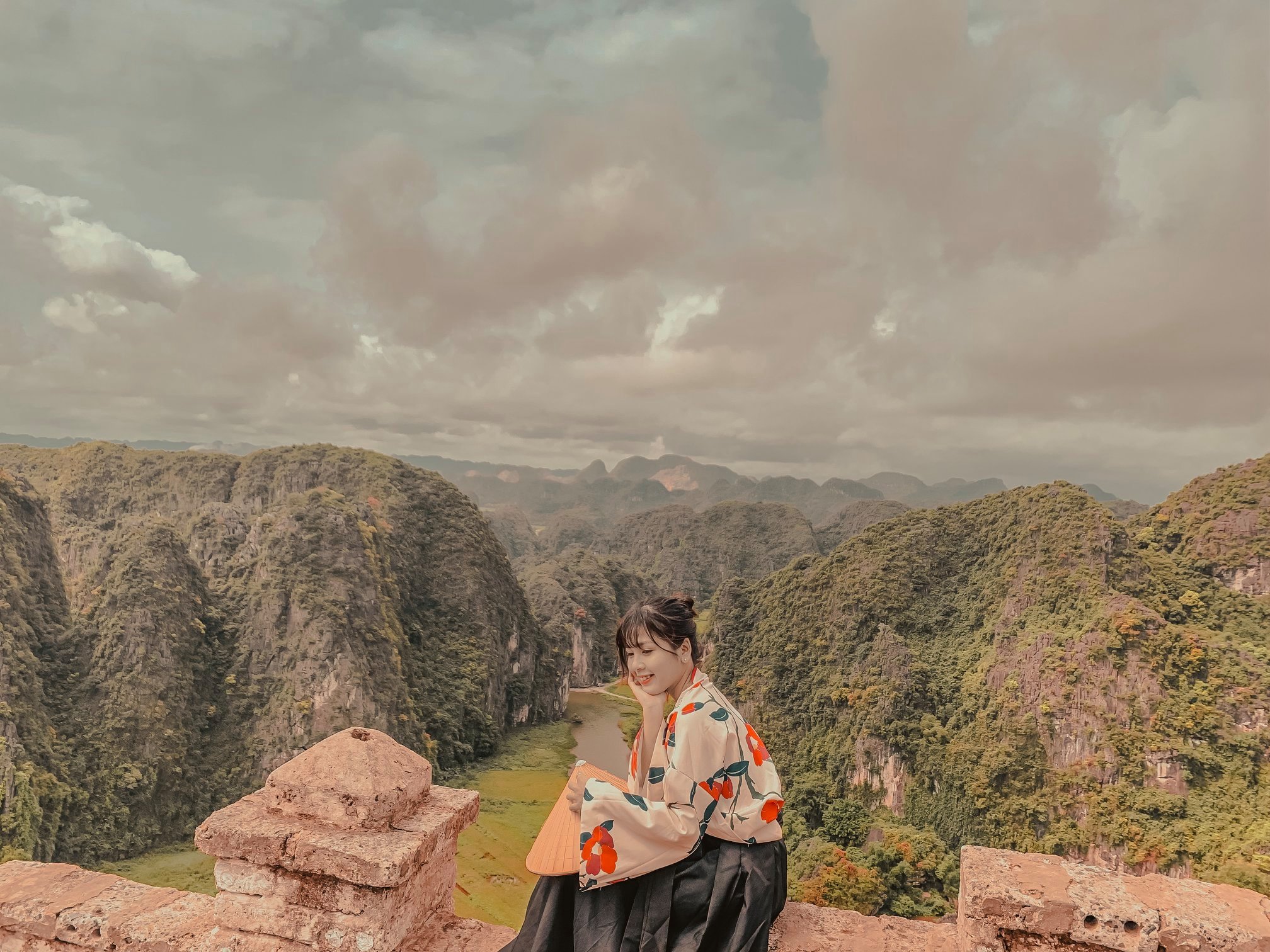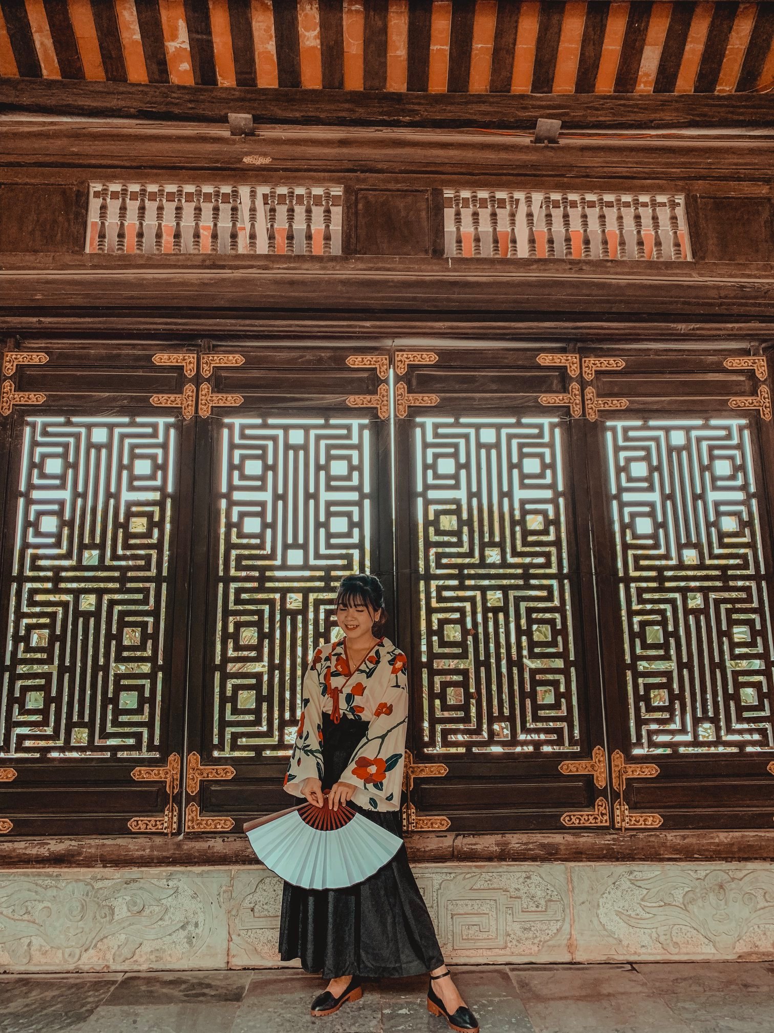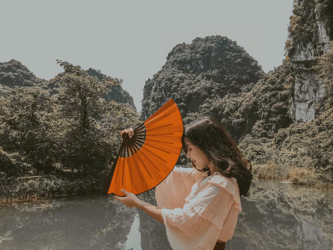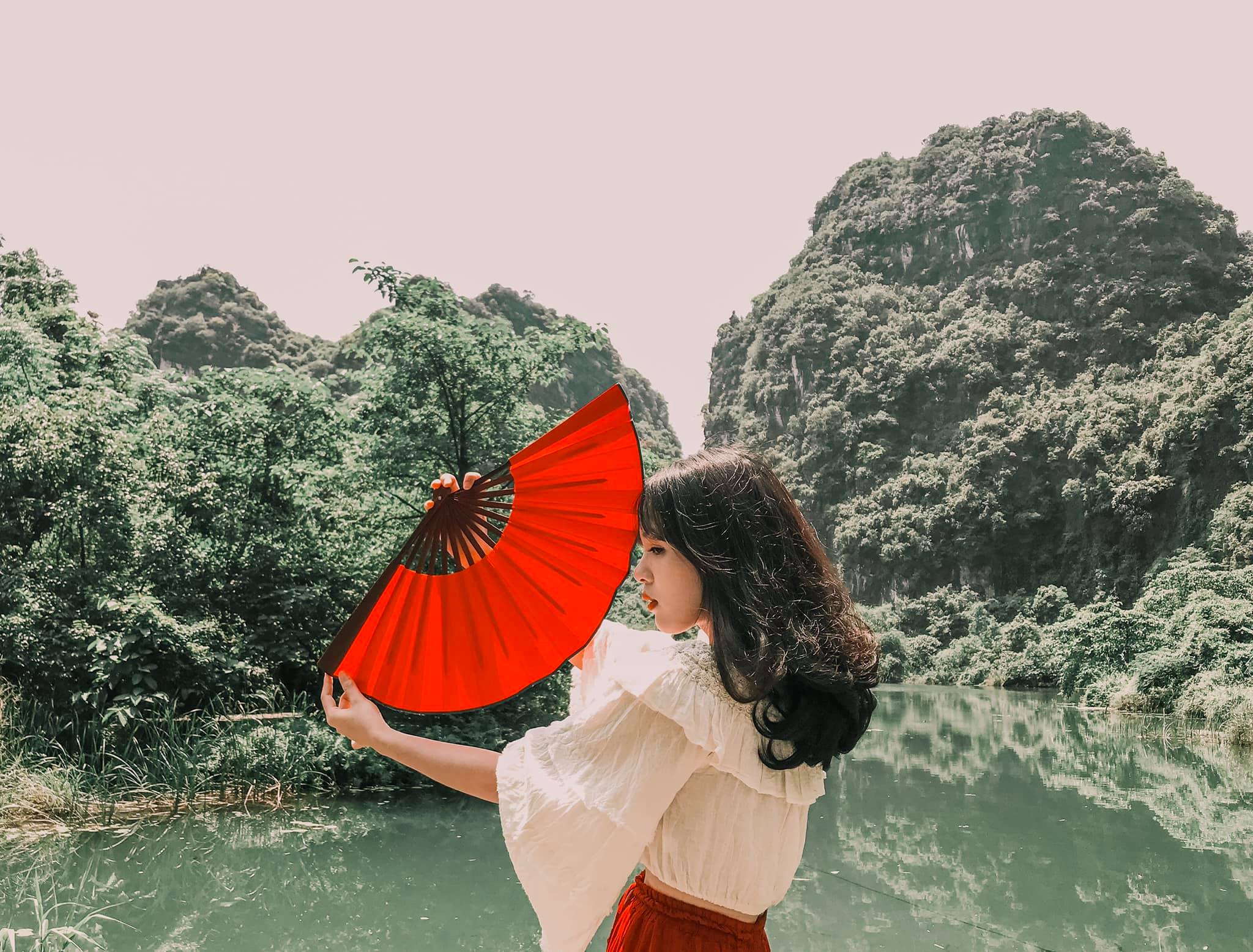 Thứ 2 là về trang phục: Vì trang phục là tuỳ theo sở thích của từng người nên mình cũng không biết nói như thế nào. Chỉ khuyên mọi người là nên mặc tone đỏ, trắng, vàng lên ảnh sẽ nổi hơn. Nếu có vào Đan Viện Châu Sơn thì mọi người phải mặc đồ dài, không hở hang. À mà mọi người nên mang theo các loại phụ kiện như: quạt, nón,… vừa giúp che nắng vừa để tạo dáng chụp ảnh. Do mình đang niềng răng không tạo được nhiều kiểu nên 10c ảnh thì 9c là cầm nón hoặc quạt rồi.