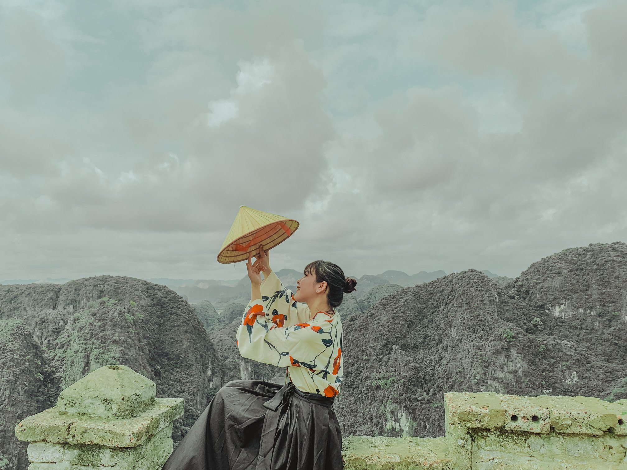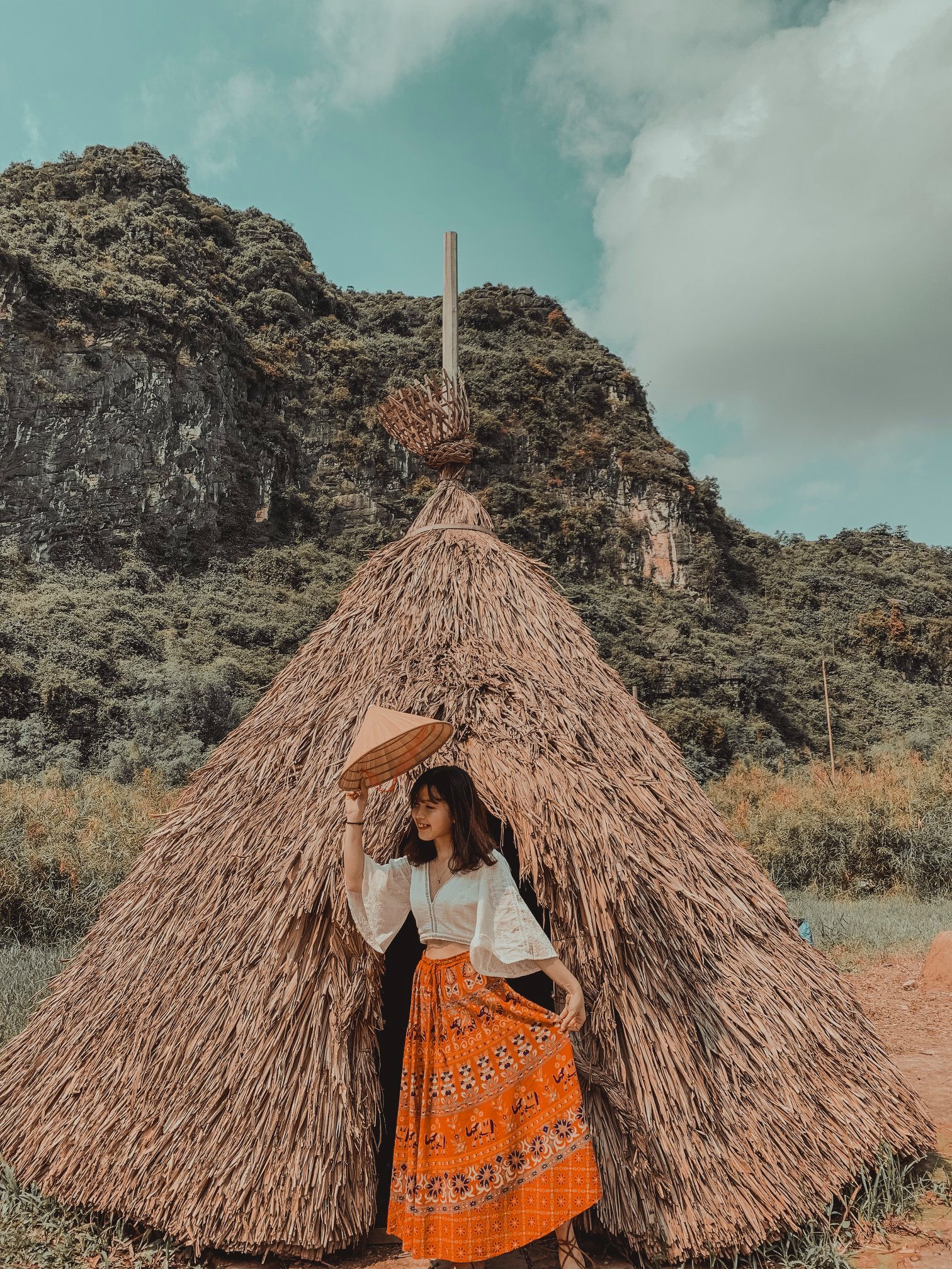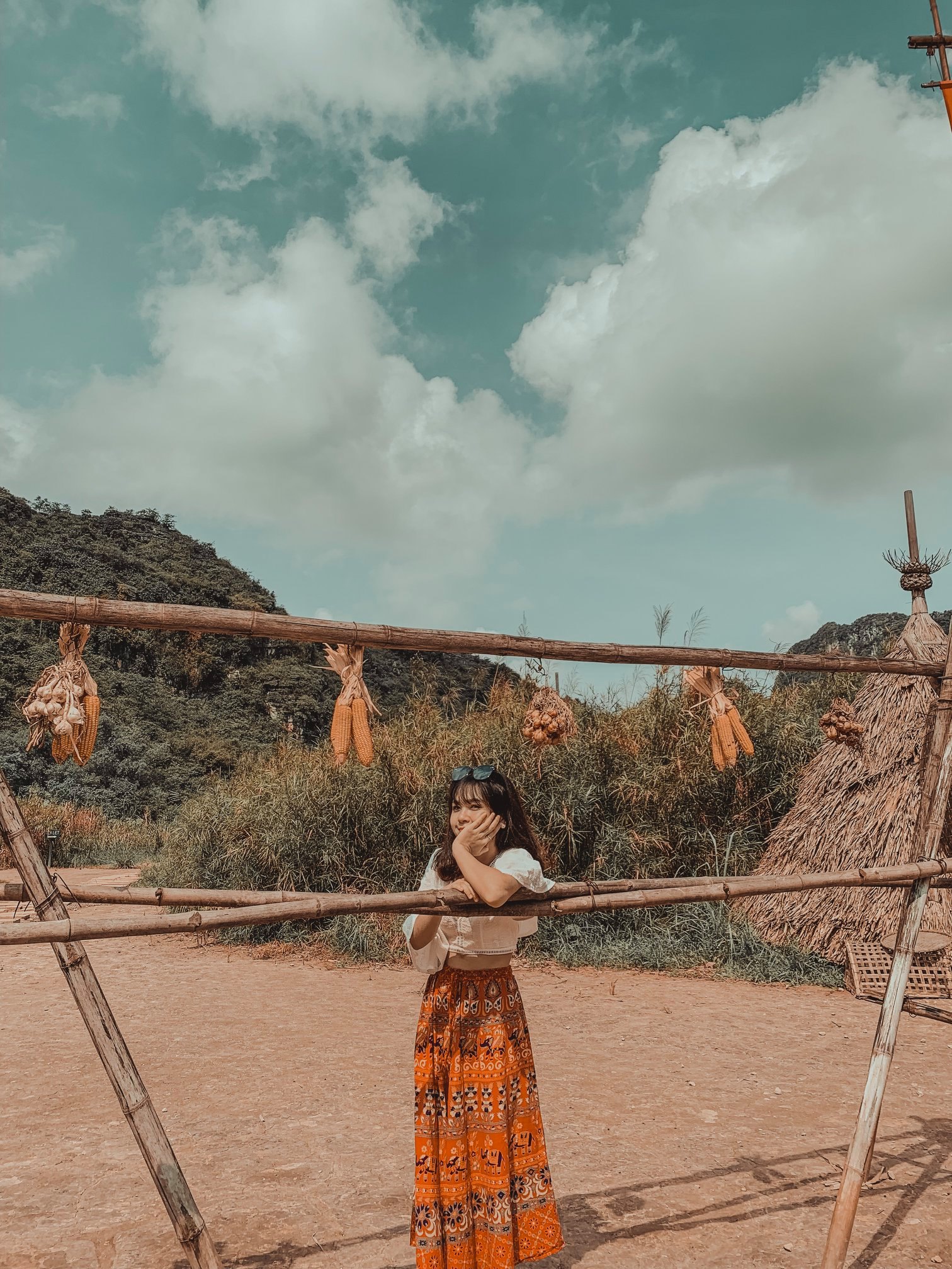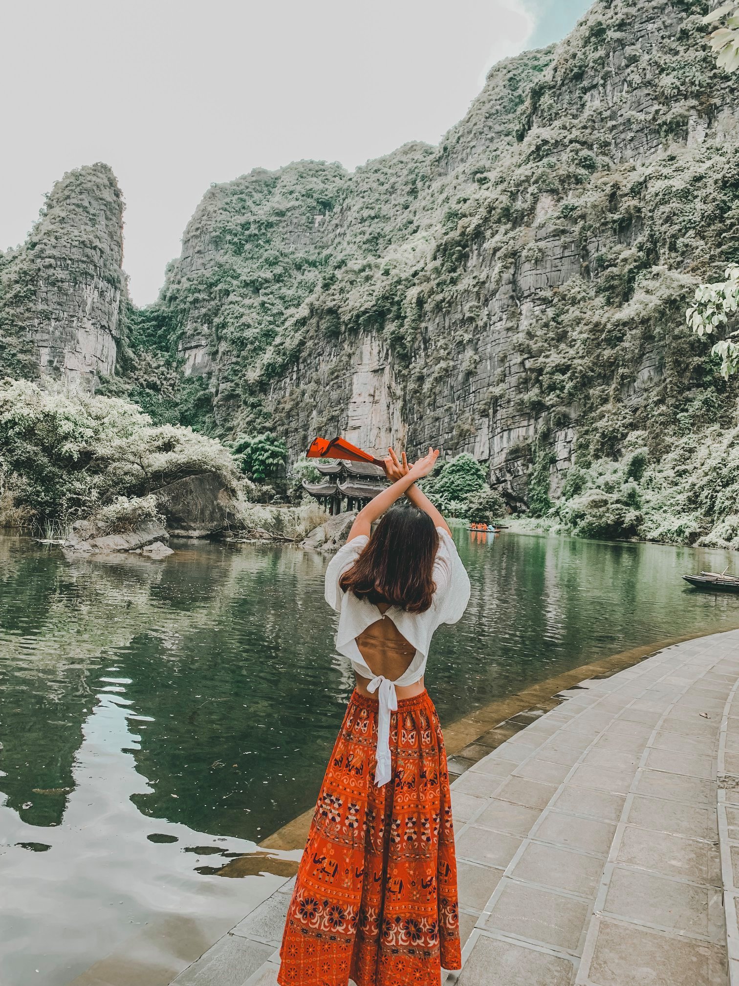 Thứ 2 là về trang phục: Vì trang phục là tuỳ theo sở thích của từng người nên mình cũng không biết nói như thế nào. Chỉ khuyên mọi người là nên mặc tone đỏ, trắng, vàng lên ảnh sẽ nổi hơn. Nếu có vào Đan Viện Châu Sơn thì mọi người phải mặc đồ dài, không hở hang. À mà mọi người nên mang theo các loại phụ kiện như: quạt, nón,… vừa giúp che nắng vừa để tạo dáng chụp ảnh. Do mình đang niềng răng không tạo được nhiều kiểu nên 10c ảnh thì 9c là cầm nón hoặc quạt rồi.