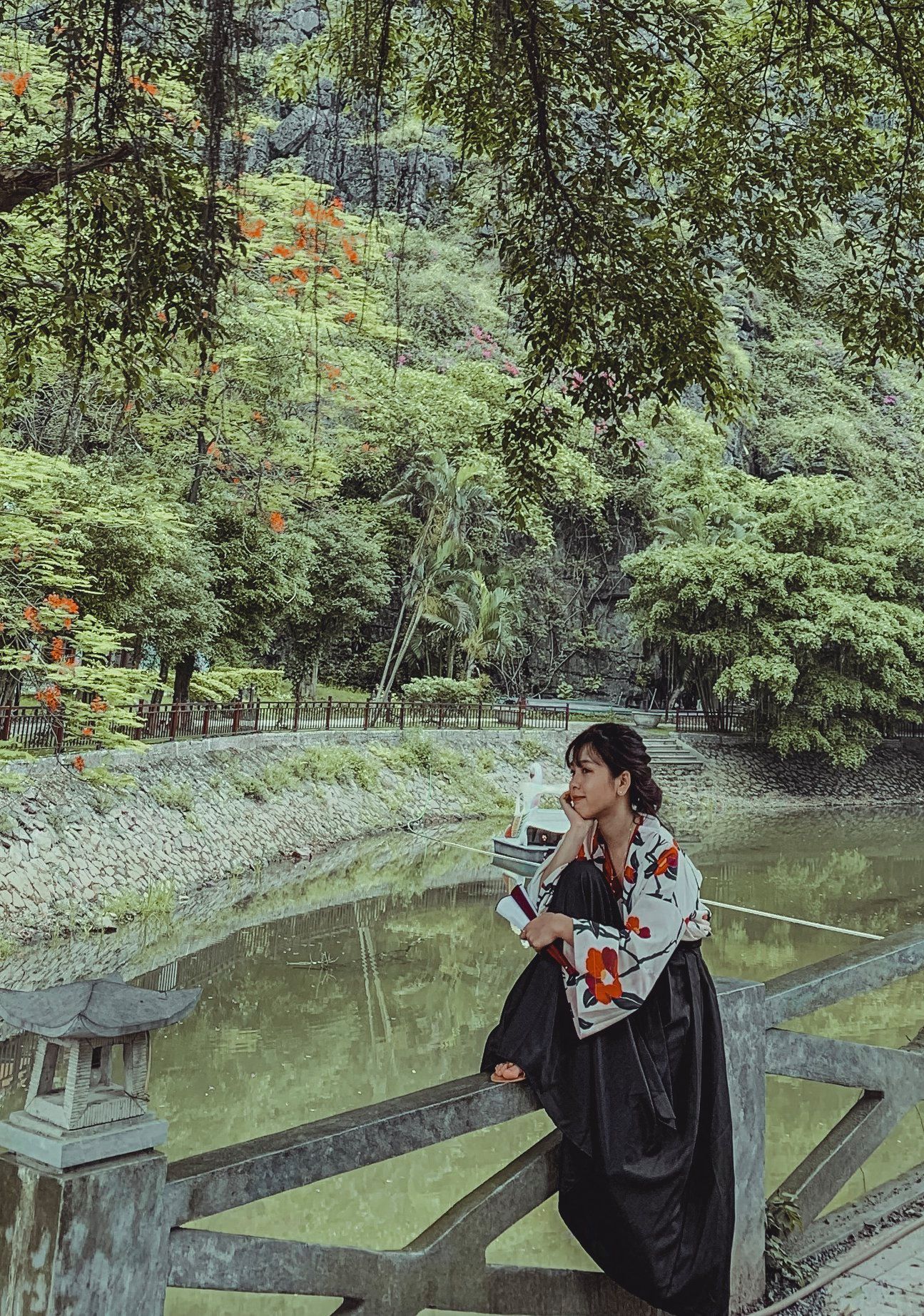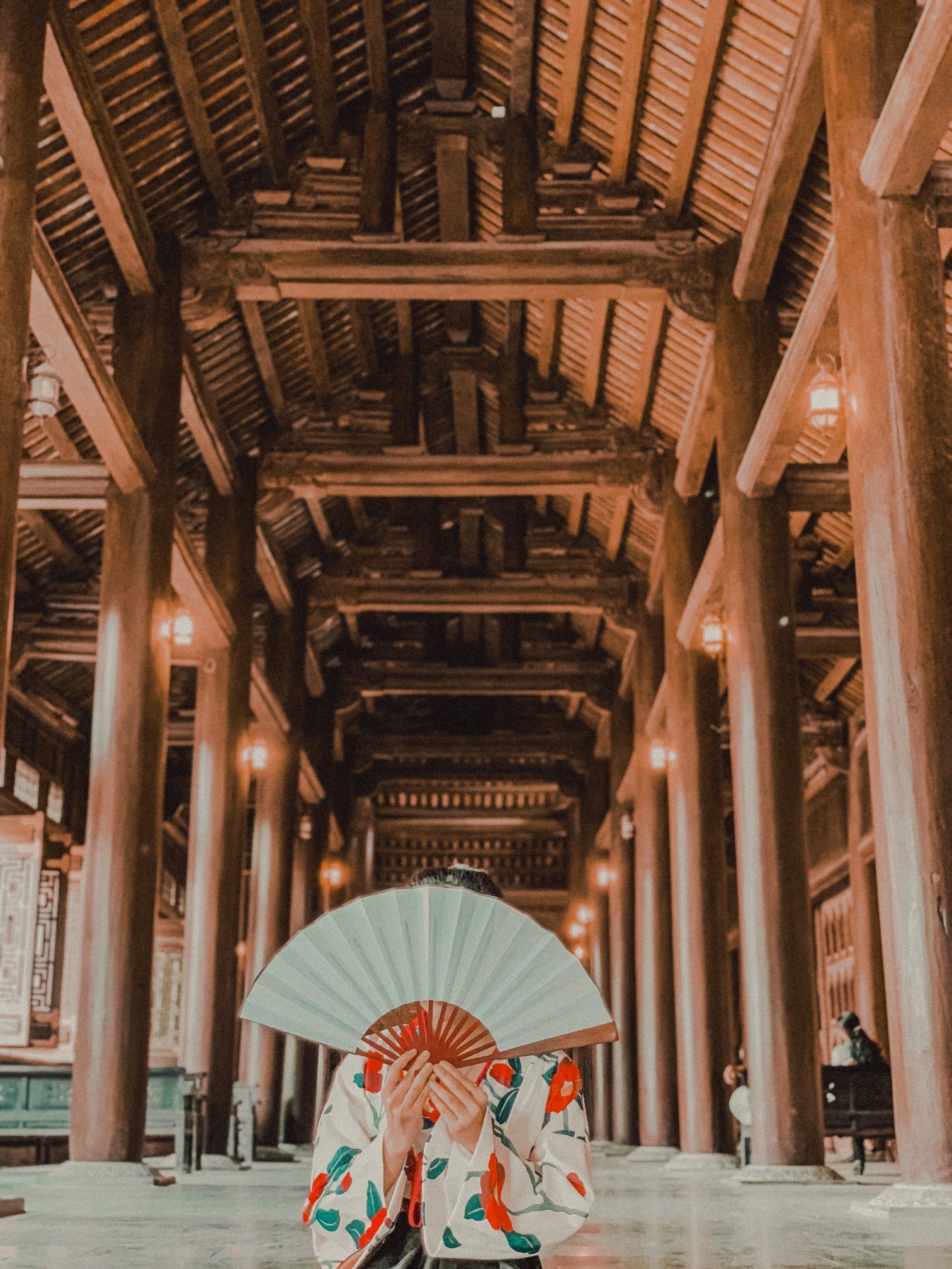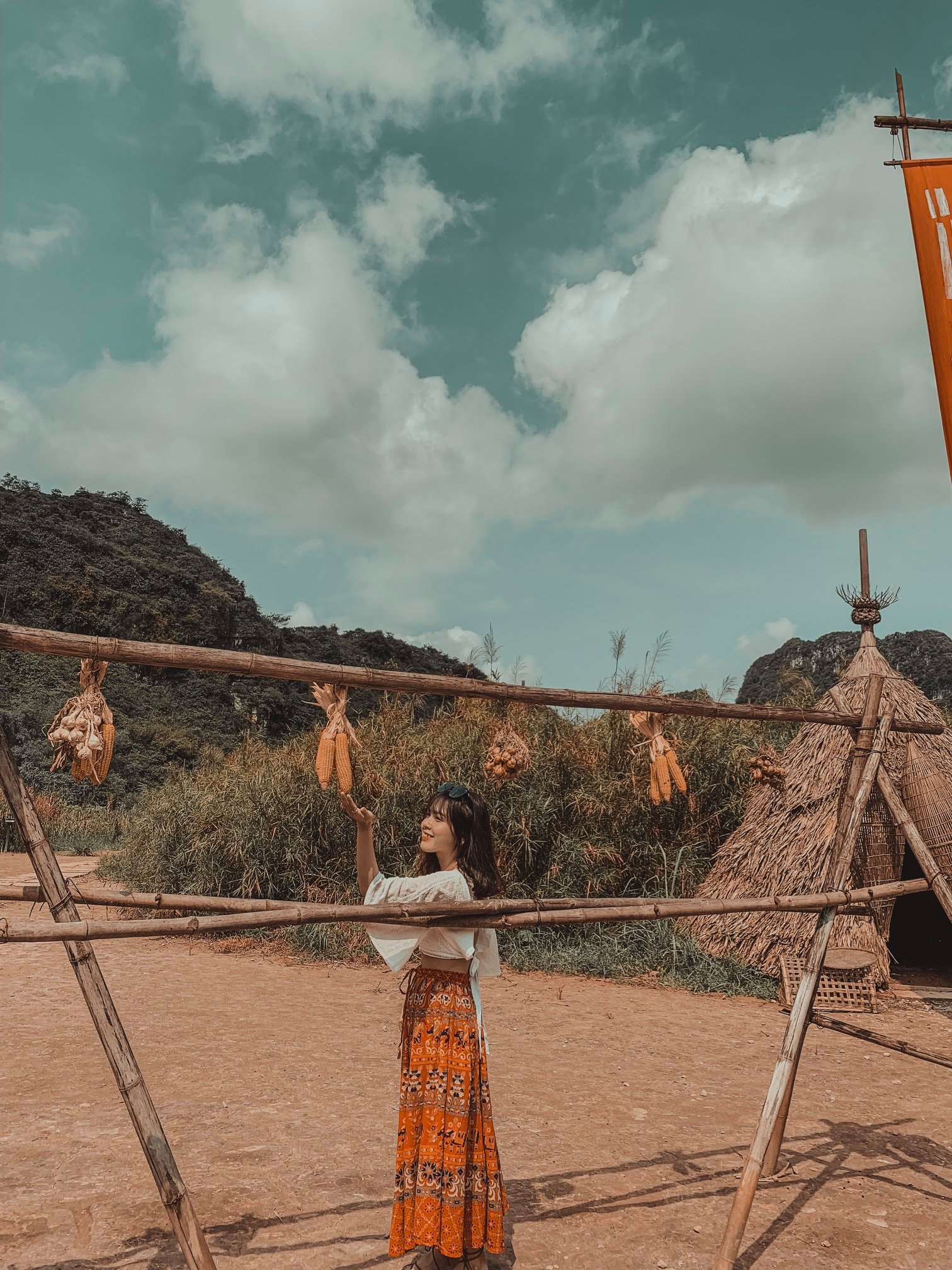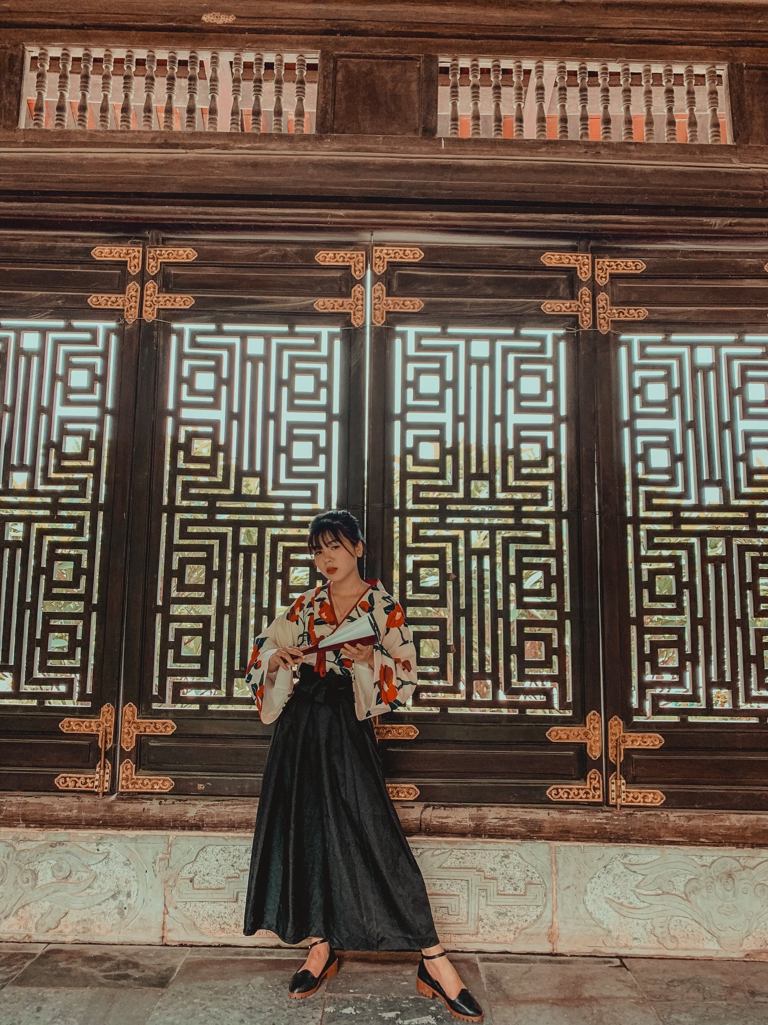 Thứ 2 là về trang phục: Vì trang phục là tuỳ theo sở thích của từng người nên mình cũng không biết nói như thế nào. Chỉ khuyên mọi người là nên mặc tone đỏ, trắng, vàng lên ảnh sẽ nổi hơn. Nếu có vào Đan Viện Châu Sơn thì mọi người phải mặc đồ dài, không hở hang. À mà mọi người nên mang theo các loại phụ kiện như: quạt, nón,… vừa giúp che nắng vừa để tạo dáng chụp ảnh. Do mình đang niềng răng không tạo được nhiều kiểu nên 10c ảnh thì 9c là cầm nón hoặc quạt rồi.
