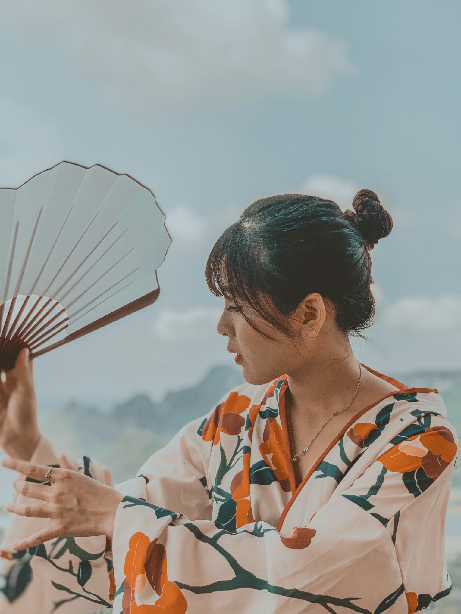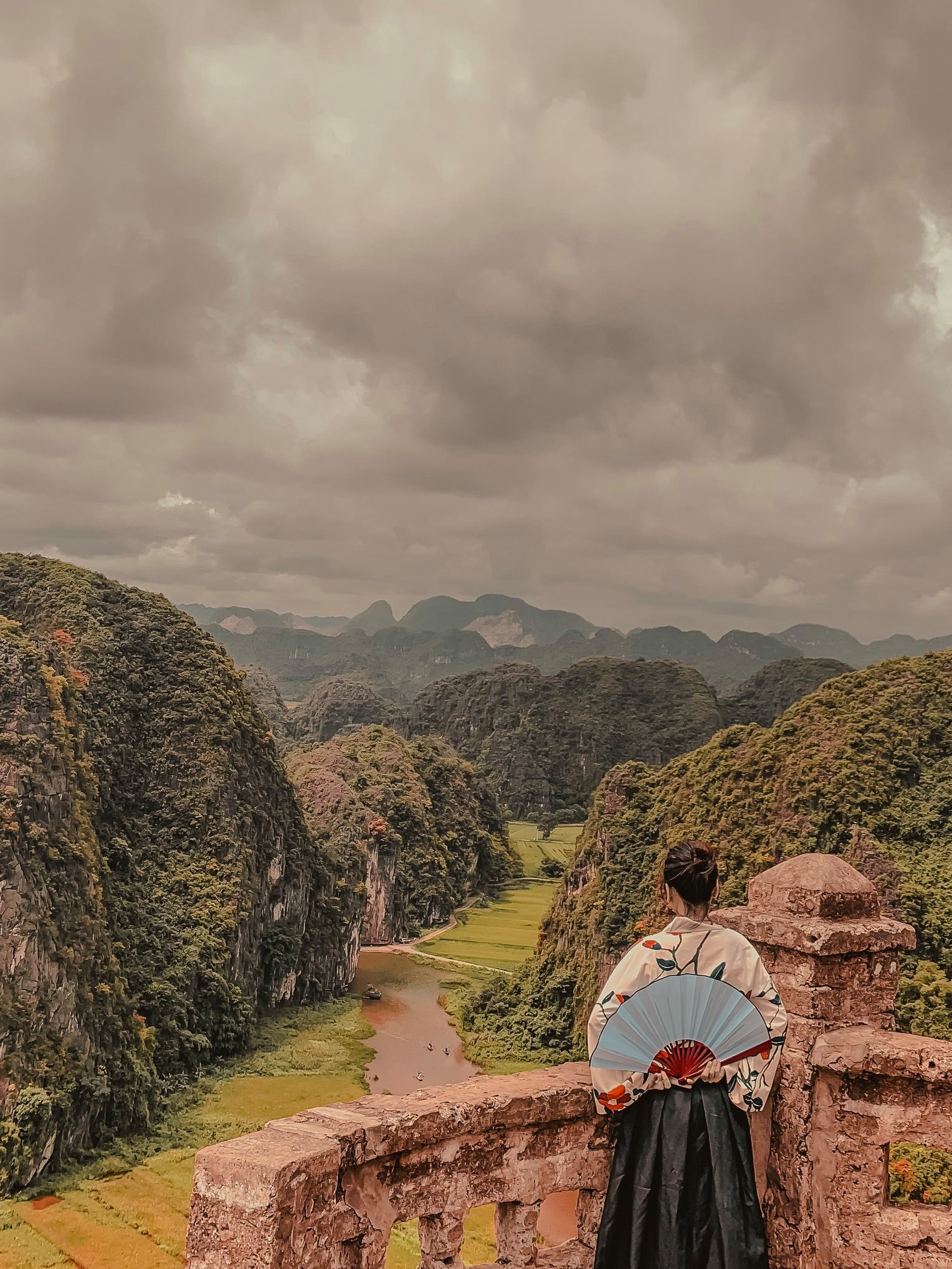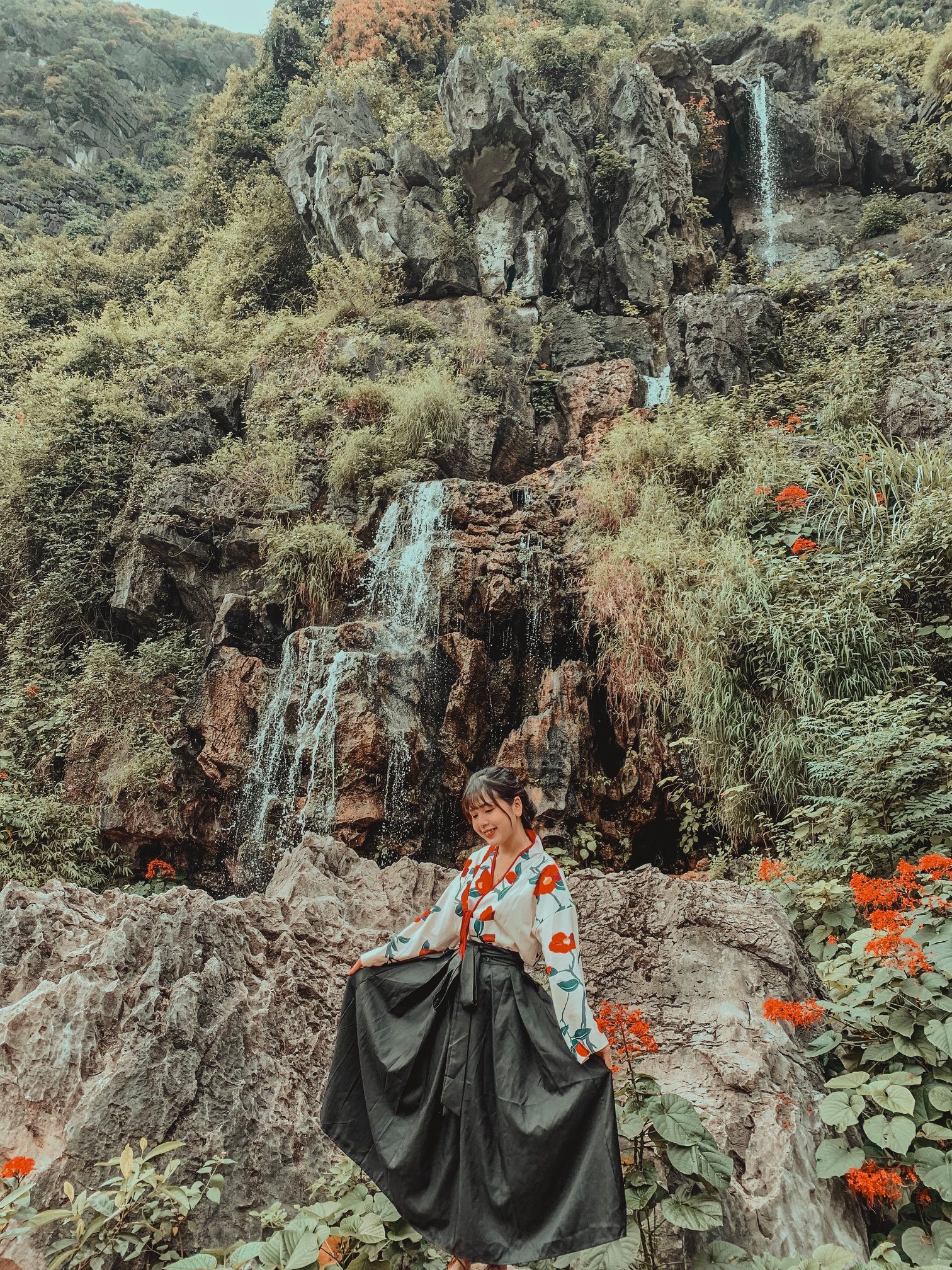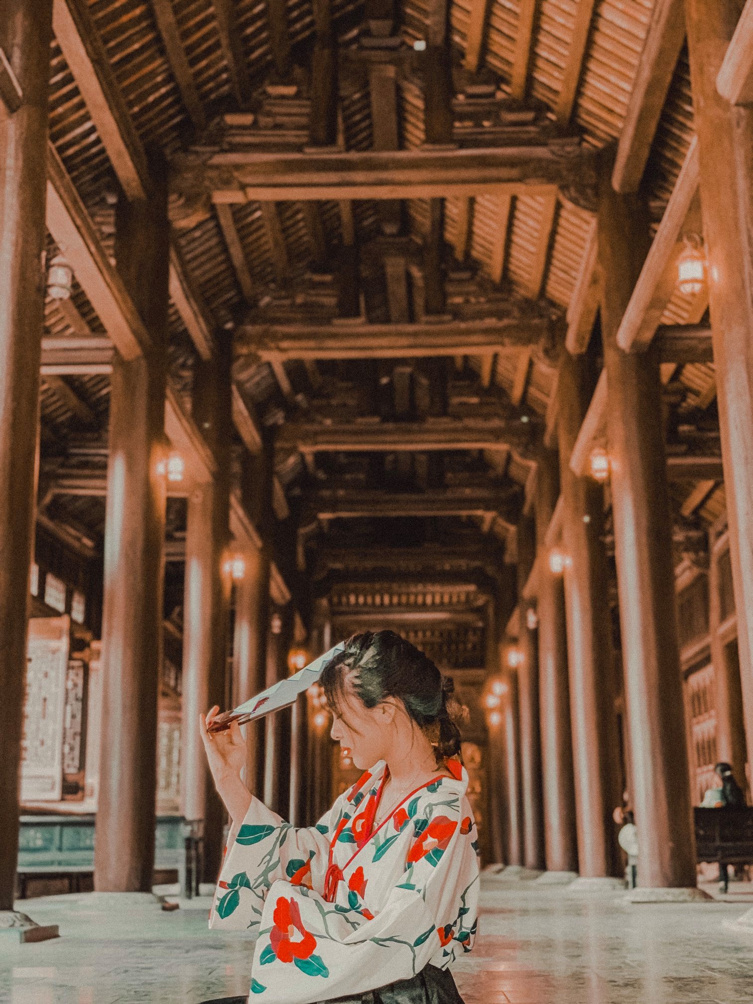 Thứ 2 là về trang phục: Vì trang phục là tuỳ theo sở thích của từng người nên mình cũng không biết nói như thế nào. Chỉ khuyên mọi người là nên mặc tone đỏ, trắng, vàng lên ảnh sẽ nổi hơn. Nếu có vào Đan Viện Châu Sơn thì mọi người phải mặc đồ dài, không hở hang. À mà mọi người nên mang theo các loại phụ kiện như: quạt, nón,… vừa giúp che nắng vừa để tạo dáng chụp ảnh. Do mình đang niềng răng không tạo được nhiều kiểu nên 10c ảnh thì 9c là cầm nón hoặc quạt rồi.