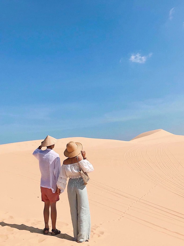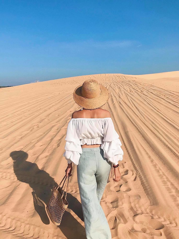 Nếu đi đông và theo nhóm bạn có thể tham khảo dịch vụ xe Jeep đi tham quan các điểm theo tour cũng rất thú vị, vì tụi mình đi 2 người và muốn thoải mái thời gian chụp hình nên chọn đi xe máy để cảm nhận được mọi thứ ở đây rõ nhất. Nếu đi xe máy như tụi mình bạn sẽ phải chạy xe vào đường của KDL Triều Trang mua vé tham quan (15k/ng lớn) rồi gửi xe sau đó bắt đầu hành trình khám phá. Đặt chân tới nơi, bạn sẽ vô cùng choáng ngợp bởi các triền cát trắng cao rộng, trải dài nối tiếp nhau như sa mạc Sahara thu nhỏ vậy. Đảm bảo lên tới đây đứng ở bất cứ góc nào bạn cũng sẽ có được những bức ảnh ảo diệu.
