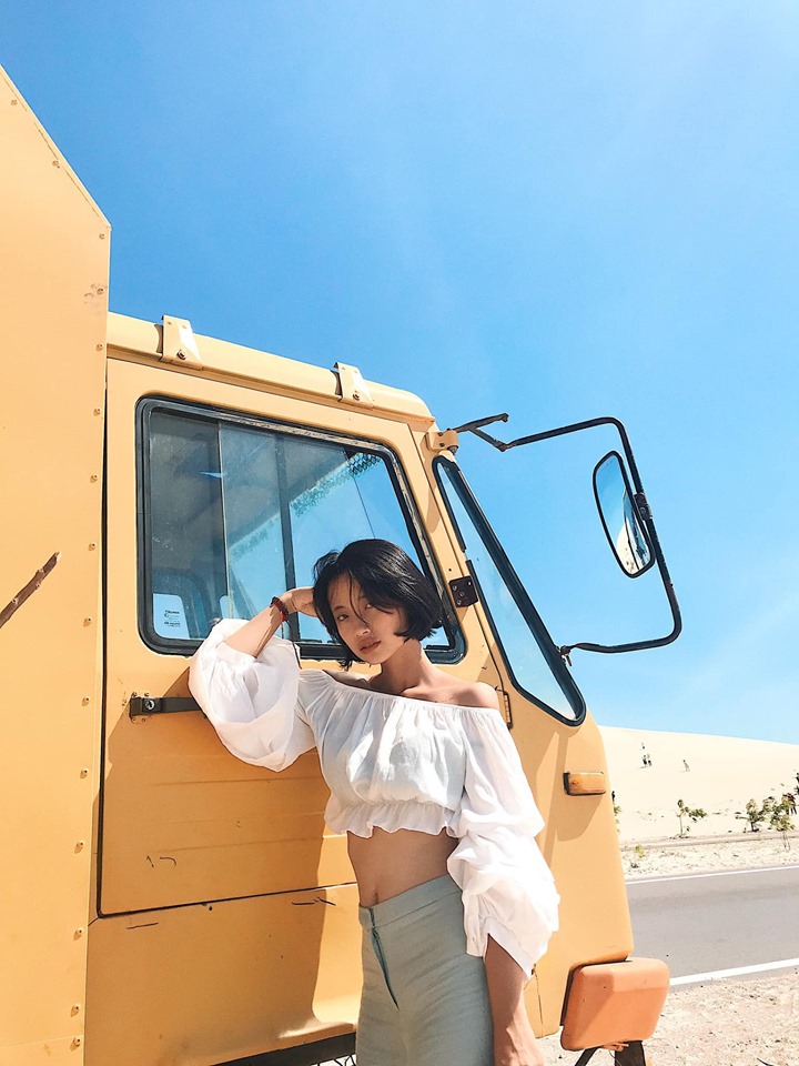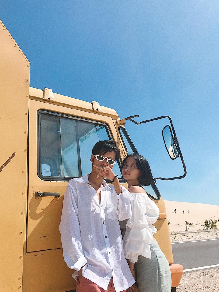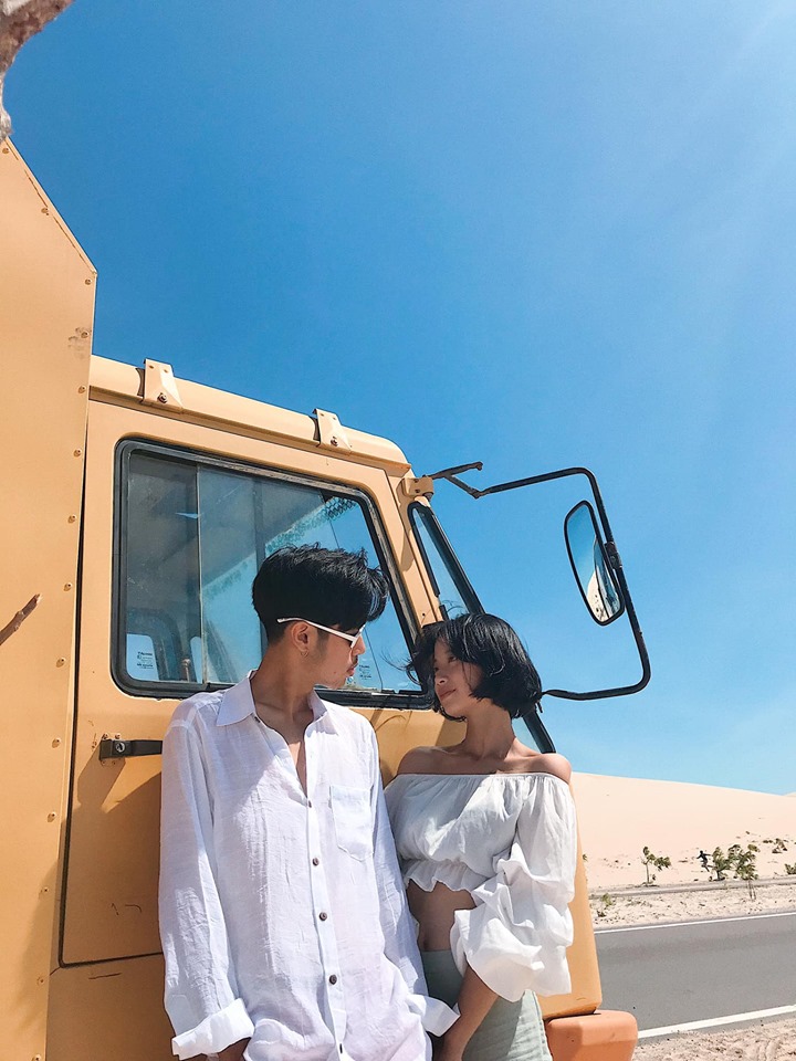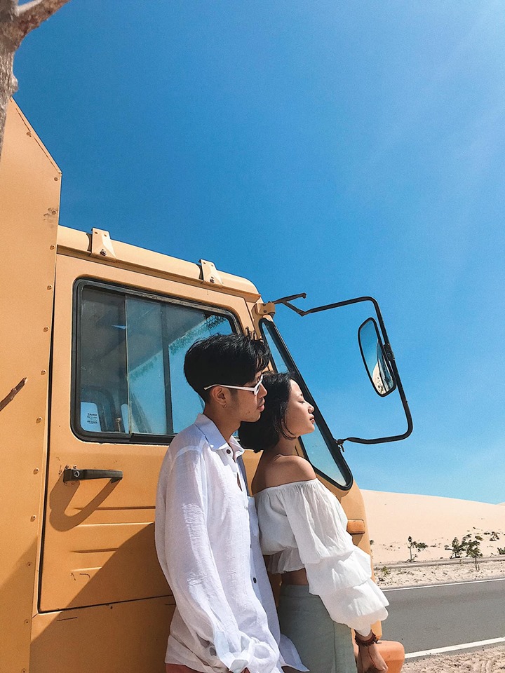 Tiếp theo tụi mình đi tới cung đường Bàu Trắng – Phan Rí Cửa (cách Bàu Trắng khoảng 7km). Hai bên đường là cát trắng mênh mông cùng con đường bê tông trải dài tít tắp. Đi khoảng một đoạn bạn sẽ thấy chiếc xe bán nước màu Vàng nổi bật giữa cung đường, đây là một điểm bạn có thể vừa nghỉ chân, vừa checkin vô cùng thú vị nha. Đồ uống ở đây giá cũng rất hợp lí, bạn gái bạn nước cũng rất dễ thương nữa, chụp hình giùm tụi mình nhiệt tình lắm nè. Ở đây bạn có thể chụp với xe, với đường và với cả biển nữa. Đúng là ở Mũi né đứng đâu cũng sẽ có những bức hình ưng ý.