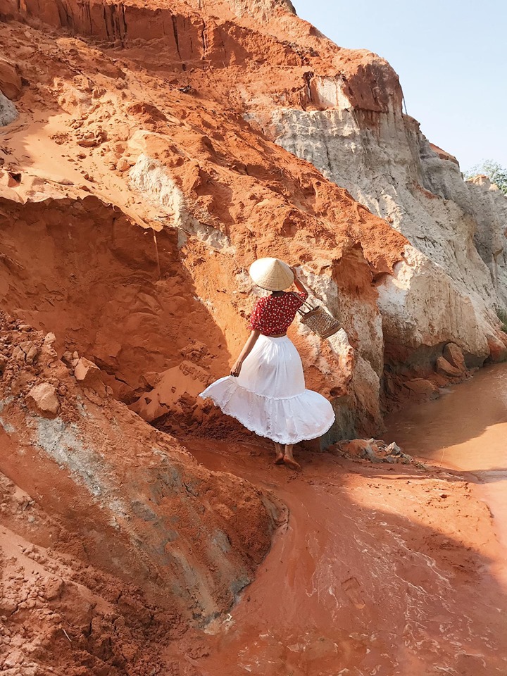 Do là ngày cuối rồi nên tụi mình sẽ đi nhưng điểm gần hơn. Sáng tụi mình dậy sớm để đi Làng Chài Mũi Né – cách khoảng 4km. Tàu thuyền tấp nập buôn bán nguyên một khu. Các bạn có thể xuống tận nơi mua hải sản tươi sống với giá rất ok. Mua bán và chụp choẹt xong mình ăn sáng rồi ghé Suối Tiên – nằm trên đường Huỳnh Thúc Kháng, ở ngay gần homestay. Tới nơi gửi xe ở nhà dân bên trên rồi tháo dép đi bộ xuống suối. Nước suối cao không quá mắt cá chân, nước trong và mát lắm nè. Bạn lội một đoạn sẽ tới cổng vào Suối Tiên, vé tham quan 15k/ng. Dọc hai bên đường lội vào suối là các nhũ đá, cột cát lớn nhỏ trắng muốt nổi lên trên nền đất đỏ tạo nên một khung cảnh hùng vĩ và tráng lệ.