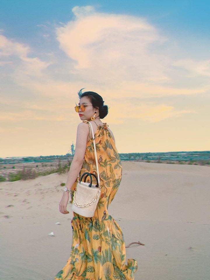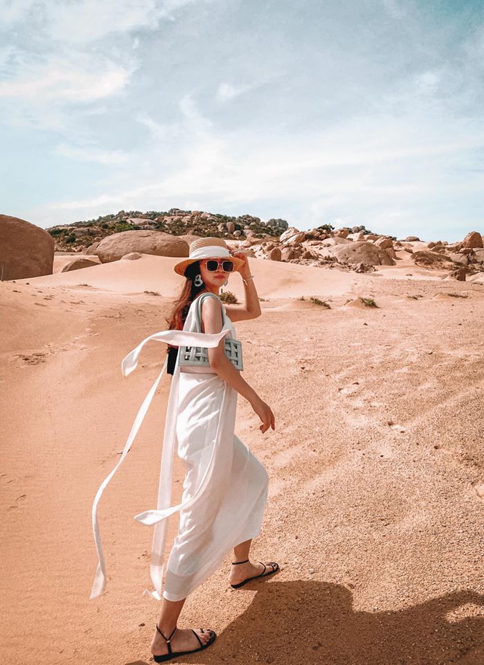 2 bà hôm nay chọn vi vu Cà Ná Mũi Dinh. Hôm nay mới hay này. Đáng nhớ luôn. Bịt kín mít vì xác định rằng nắng Ninh Thuận siêu siêu gắt. Bọn mình đi đến đồi cát Mũi Dinh đầu tiên. Thấy bảo con đường đi đến đây là cung đường đẹp nhất Việt Nam 2 đứa hí hửng mãi không thấy. Trên đường đi được chiêm ngưỡng quạt xay gió siêu to khổng lồ. Vào đến bãi cát Mũi Dinh. Đẹp dã man. Đoạn đi vào đường cát sỏi rất khó đi.