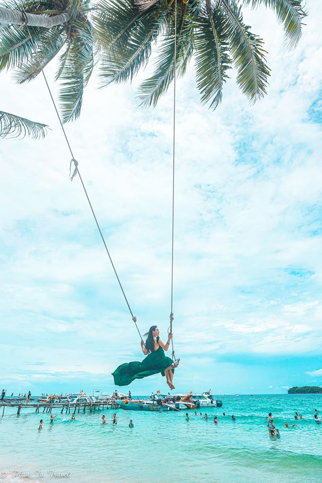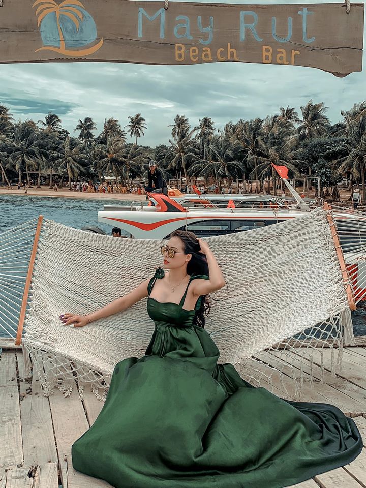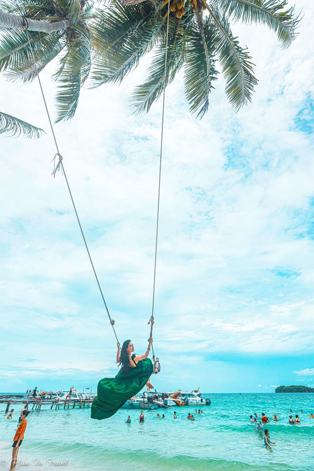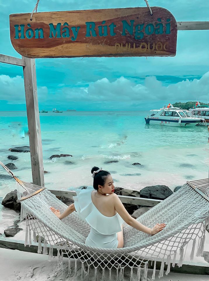Đến nơi lúc 9h sáng: Tụi mình thuê rô tô riêng 7 chỗ tự lái để di chuyển qua các điểm chơi. Mình ghé qua bãi sao là bãi biển đẹp nhất Phú Quốc: ở đây có cây dừa đổ, xích đu, võng trắng…. Nói chung rất nhiều view sống ảo cho các bạn trẻ heng.