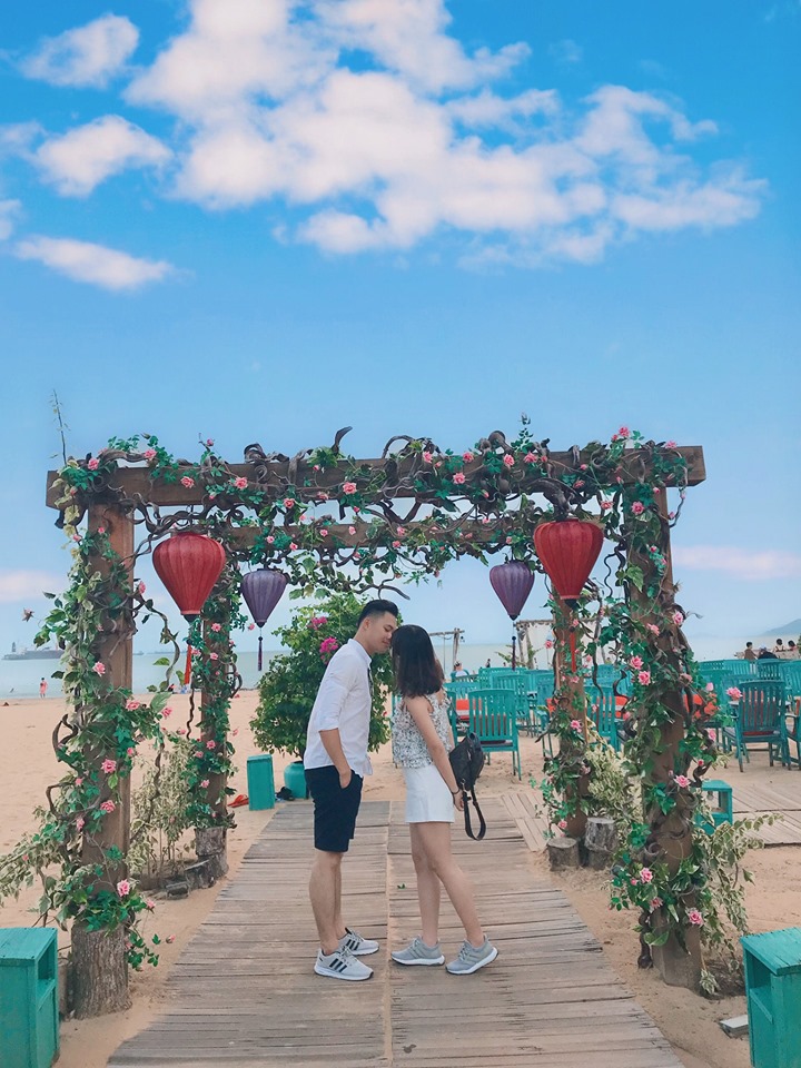 Cất vali xong bọn mình thuê xe máy của cô chú (100k/ngày) thẳng tiến check-in Tháp Đôi luôn. Vé vào cổng là 20k/người vào tha hồ mà sống ảo ạ. Vì mải mê quá nên tận 5h bọn mình mới đi ra Surf Bar chụp ảnh được. Ra Surf Bar cũng lại toàn là view đẹp luôn, cứ nghĩ là view biển như vậy đồ uống chắc phải đắt lắm, ai ngờ đồ đắt nhất trong menu mới có 65k thì phải.