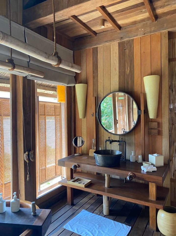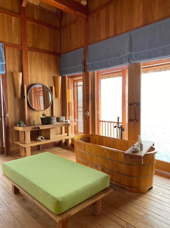 1 căn Water Reserve căn villa dành cho 6 người lớn ở, căn này có 3 khu, mỗi khu là 1 nhà to có đầy đủ phòng ngủ & phòng tắm cực rộng dành cho 2 người. Riêng khu chính là 1 nhà 2 tầng, tầng 2 là phòng ngủ, tầng 1 là phòng sinh hoạt chung của gia đình có wifi, có tivi, tủ lạnh, tủ rượu vang, bàn ăn, bếp đầy đủ… Phải nói căn này đẹp tiện ích, phòng ngủ thì ga gối sạch sẽ thơm lừng, phòng tắm thì rộng thênh thang (hơn cả cái nhà ở mình luôn nè). Đoạn phòng tắm có bồn tắm gỗ nằm ngay giữa phòng, trước mặt view biển mênh mông, cảm giác thư giãn và cực chill nhé bật nhạc nằm thư giãn nữa thì phê tít các bạn ạ.
