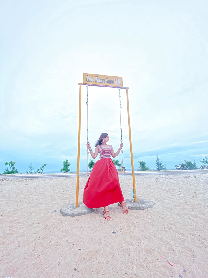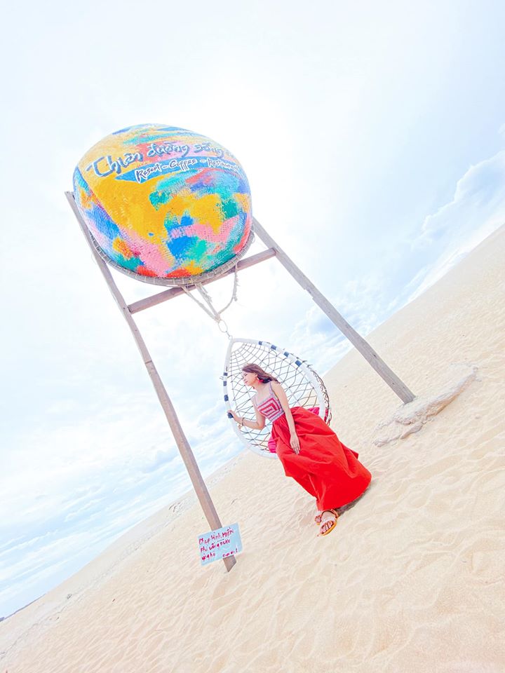 - Tiếp đó tụi mình ghé qua cung đường Bàu Trắng và ghé xe cam Bàu Trắng, ở đây ngoài được đi trên cát thì các bạn còn được chụp ảnh chung vs xích đu này nọ do quán làm, gia đình chủ quán cũng cực nhiệt tình và vui vẻ luôn, mình uống nước dừa giá 25k 1 trái