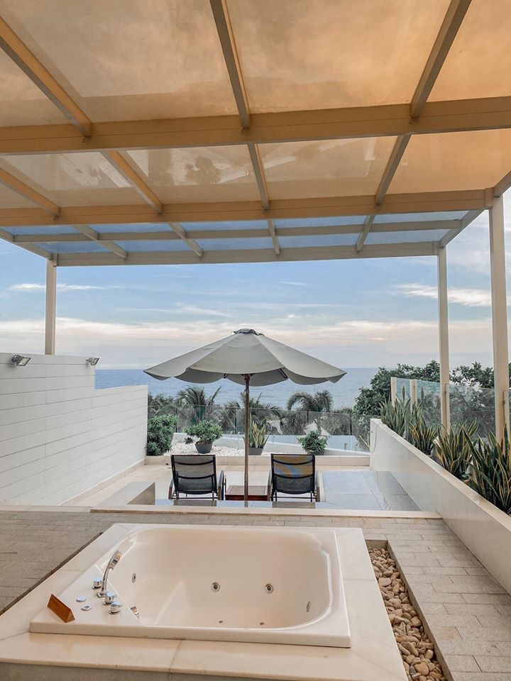 Đặc biệt mình chọn căn phòng này là Terra Ocean sở hữu bồn tắm Jacuzzi ngoài trời, bạn sẽ tận hưởng cảm giác vừa tắm nắng và nhâm nhi ly rượu. Ta nói ở đây ngắm bình minh hay hoàng hôn cũng xuất sắc lắm à nghen. Chỗ này cũng chính là signature của The Cliff Resort & Residences Phan Thiết đó.